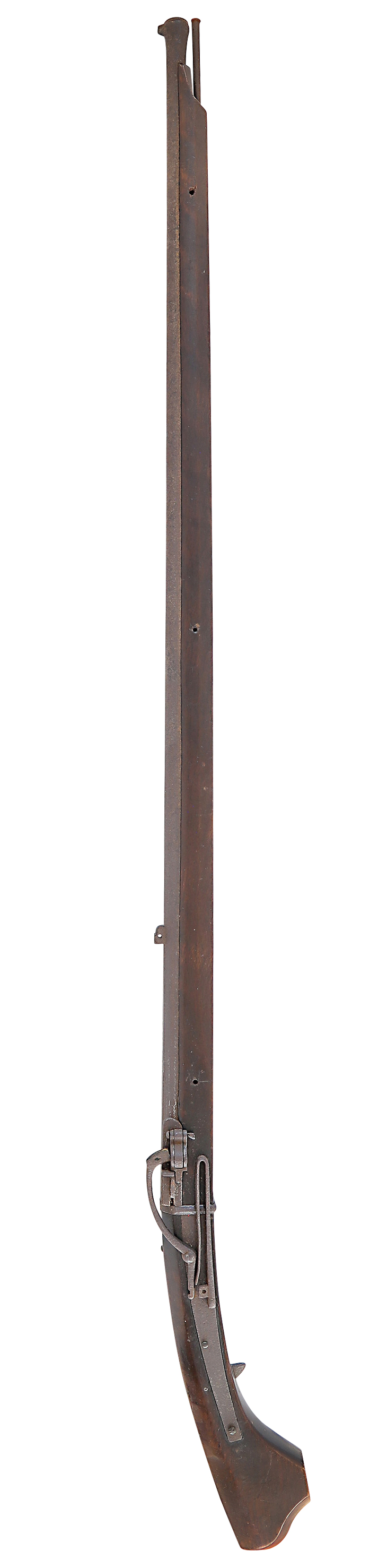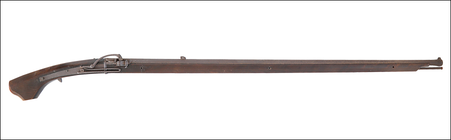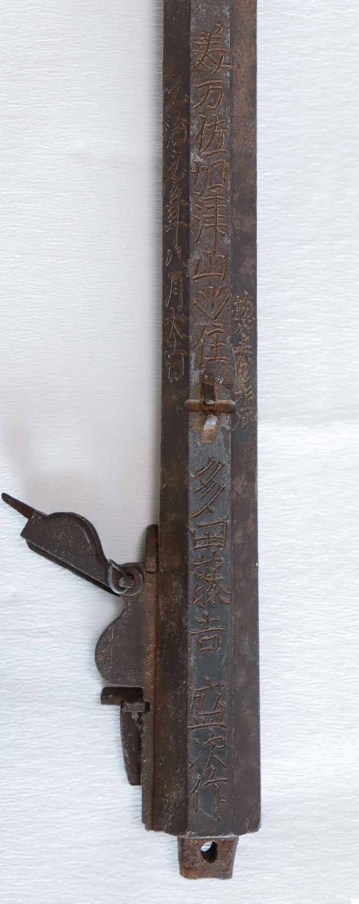 この火縄銃は、「惣巻張 美万佐加津山□住多田藤吉盛次作 元治元年八月大吉」と備前鍛冶銘、年期入りで、銃身は上面を丸くした(丸のような八角)銃身で、銃口は蕾型の柑子で、先目当:三角、元目当:片袖筋割りで、外カラクリは動きますが調整が必要です。カルカは鉄製で、現状では尾栓は外れません。台木は、備前筒の特徴である虎杢模様はないですが、黒く仕上げられています。