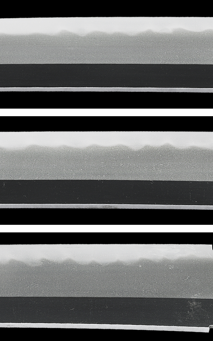 小互の目乱れを主体に、やや角張った刃、尖り風の刃を交えた刃は、所々僅かに逆掛かり、刃中小互の目足良く入り、所々金筋、砂流し掛かるなど、如何にも直胤系相伝備前の典型という出来です。