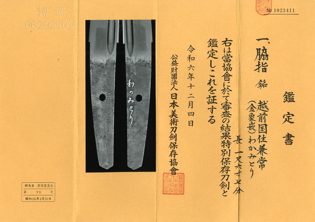 昭和二十六年三月の古い登録証は、群馬県登録『第九三号』、貴重な銘振りも含め、同工の代表作になるでしょう。