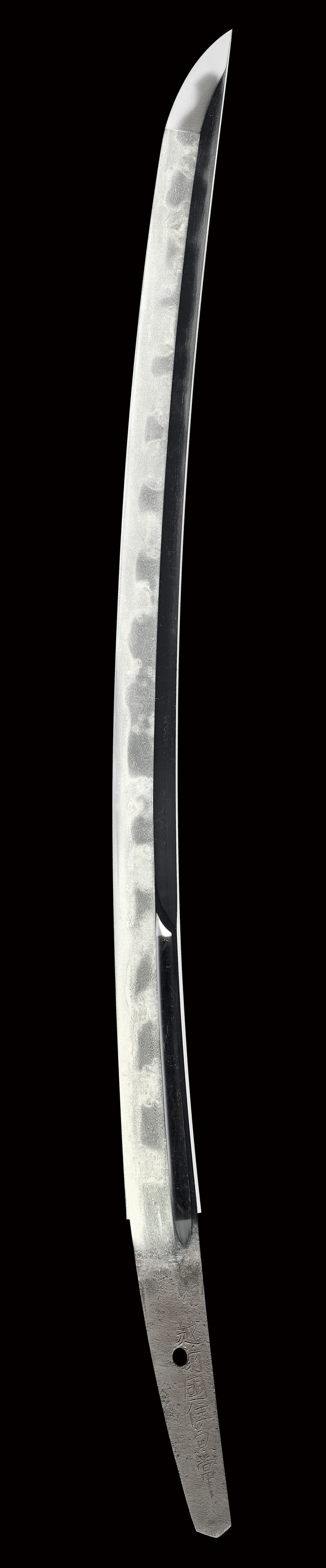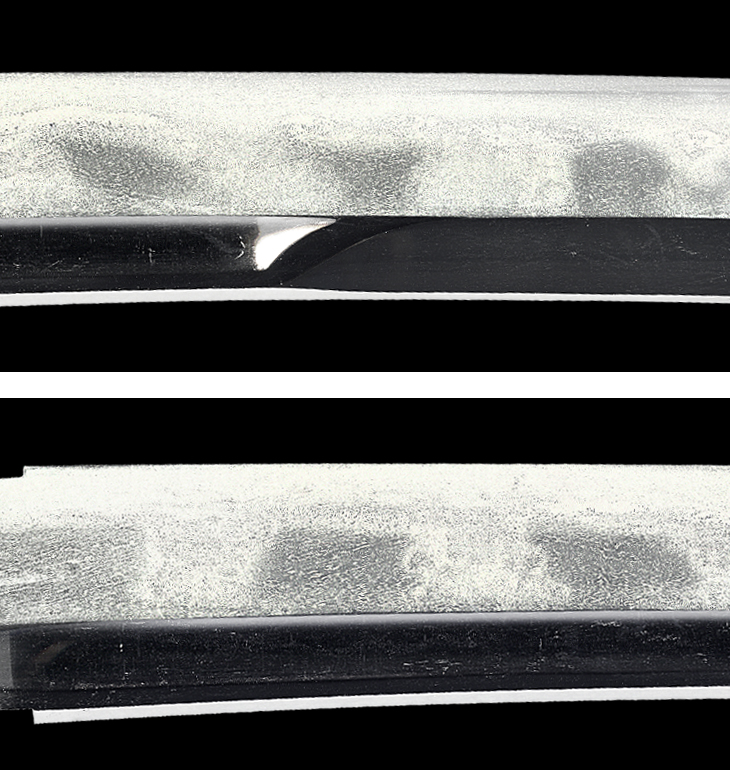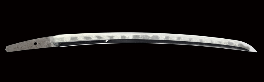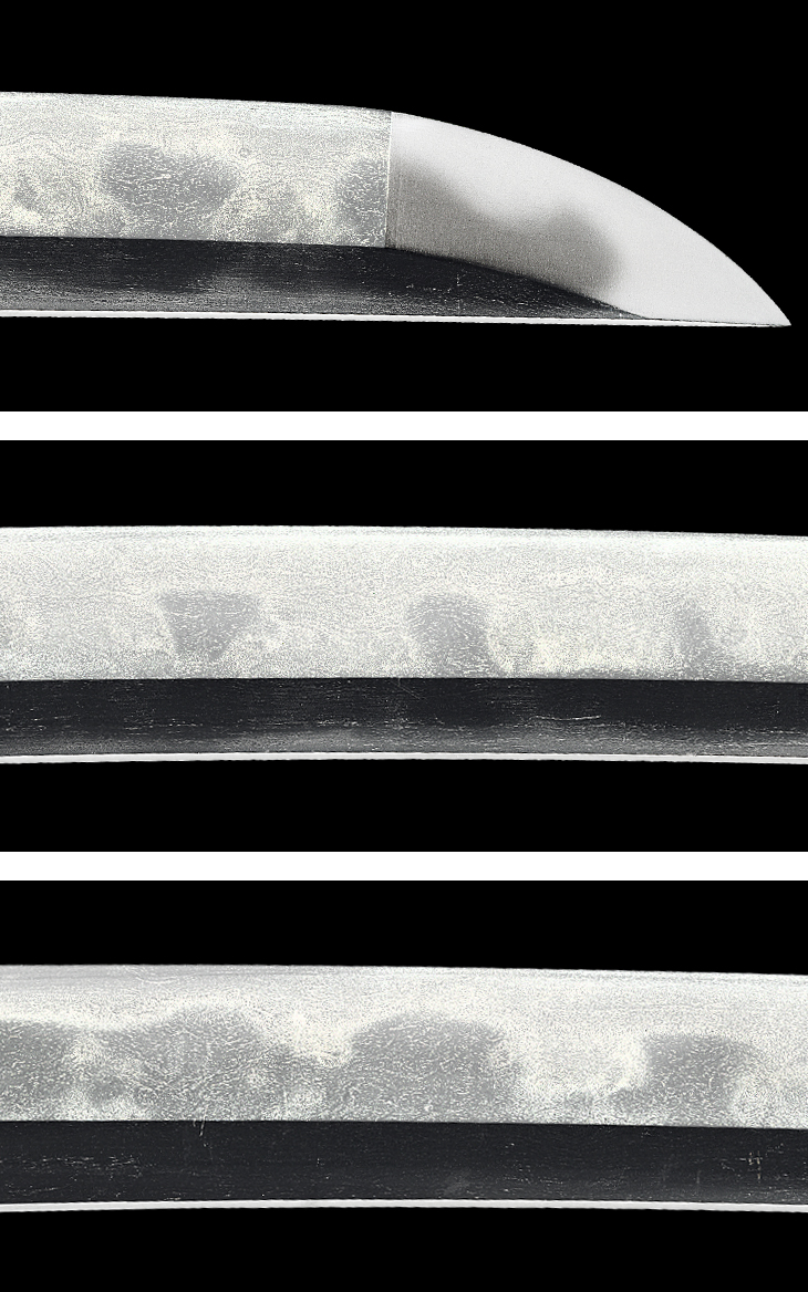 鎬地に掛かる大模様の団子丁子風乱れを主体とした刃文は、湾れ、互の目を交えてやや腰開きとなり、刃縁良く沸付いて匂い深く明るく冴え、刃中金筋、砂流し掛かり、一部丁子のくびれ部分が切れて大きな丸い飛び焼きとなっています。 帽子も深く返って鎬地を断続的に焼き下げるなど、上半は皆焼状を呈しており、刃健やかで大変良く出来ています。