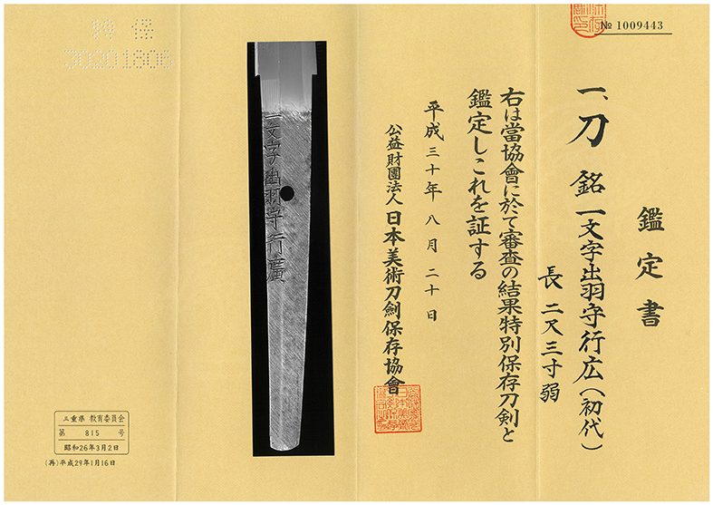 銘は、『肥州出羽大掾行廣』、『一出羽守行廣』、『一肥前国出羽守藤原行廣』、『一文字出羽守行廣』などと切ります。