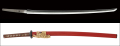 打ち刀拵え(全長101 柄長24.5 現代作 鞘 朱の呂塗 こじり、栗型、鯉口は黒塗り 下げ緒、金茶 柄 親鮫に焦げ茶柄巻き 縁頭、赤銅岩盤地、高彫金象嵌 蔓に蔦の図 目貫、赤銅容彫金色絵、蔦の葉図 鍔 鉄地撫角形透、松に笹図)付き。