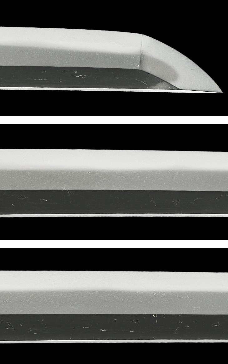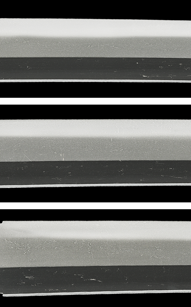 本作は、生ぶ無銘、茎には之定銘の金象嵌銘があり、鑑定でもこの極めを認めています。前述した、いわゆる『来写し』と呼ばれる、美濃鍛冶特有の作風です。