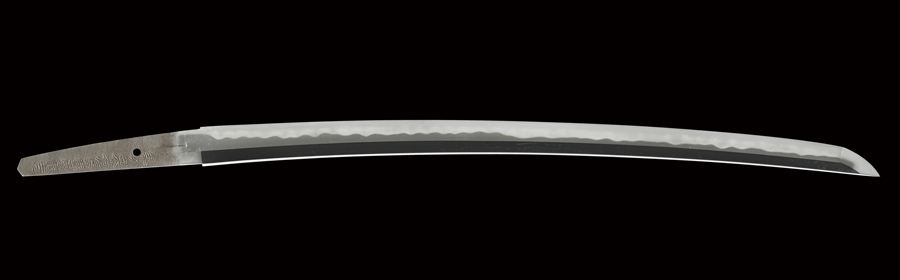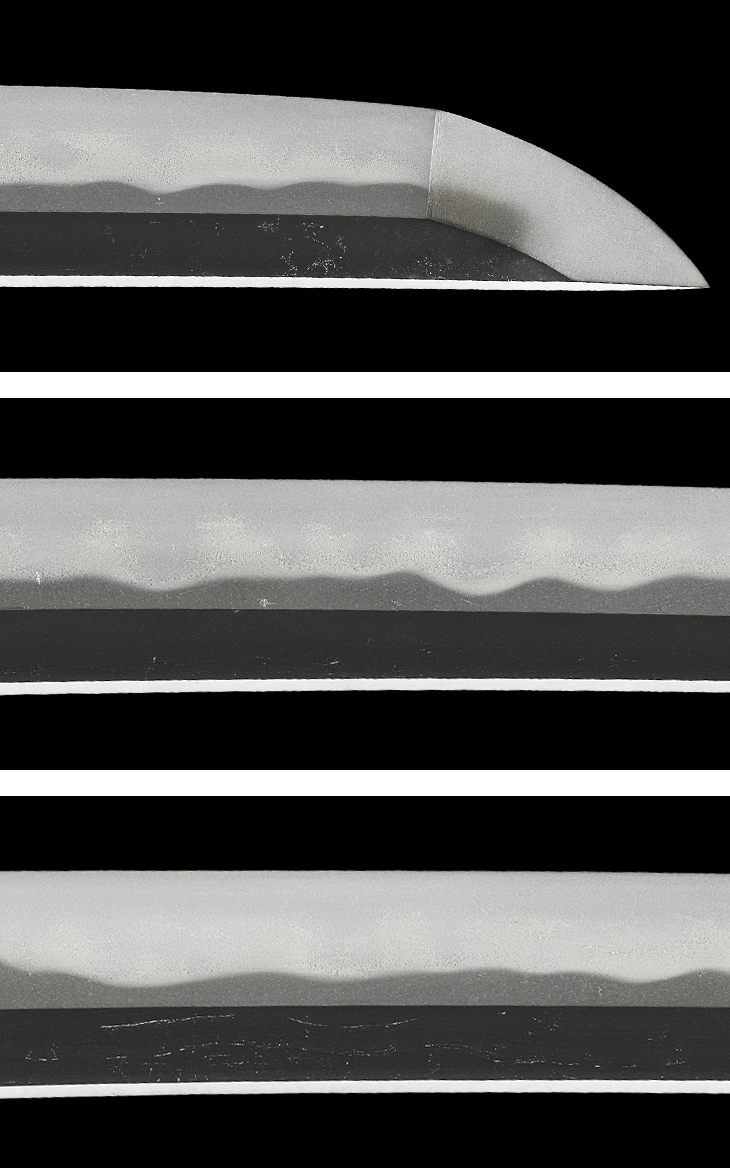 流れ心に上品に肌立つ地鉄、互の目乱れ主体で、丁子風の刃、尖り風の刃、小互の目交じりの刃は、刃中互の目足入り、金筋、砂流し掛かるなど、焼き深く覇気のある出来映えで、美濃伝を良く吸収した千子一派らしい佳品です。