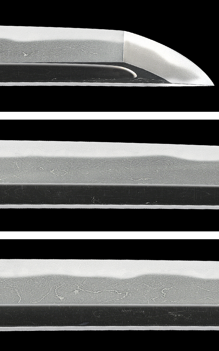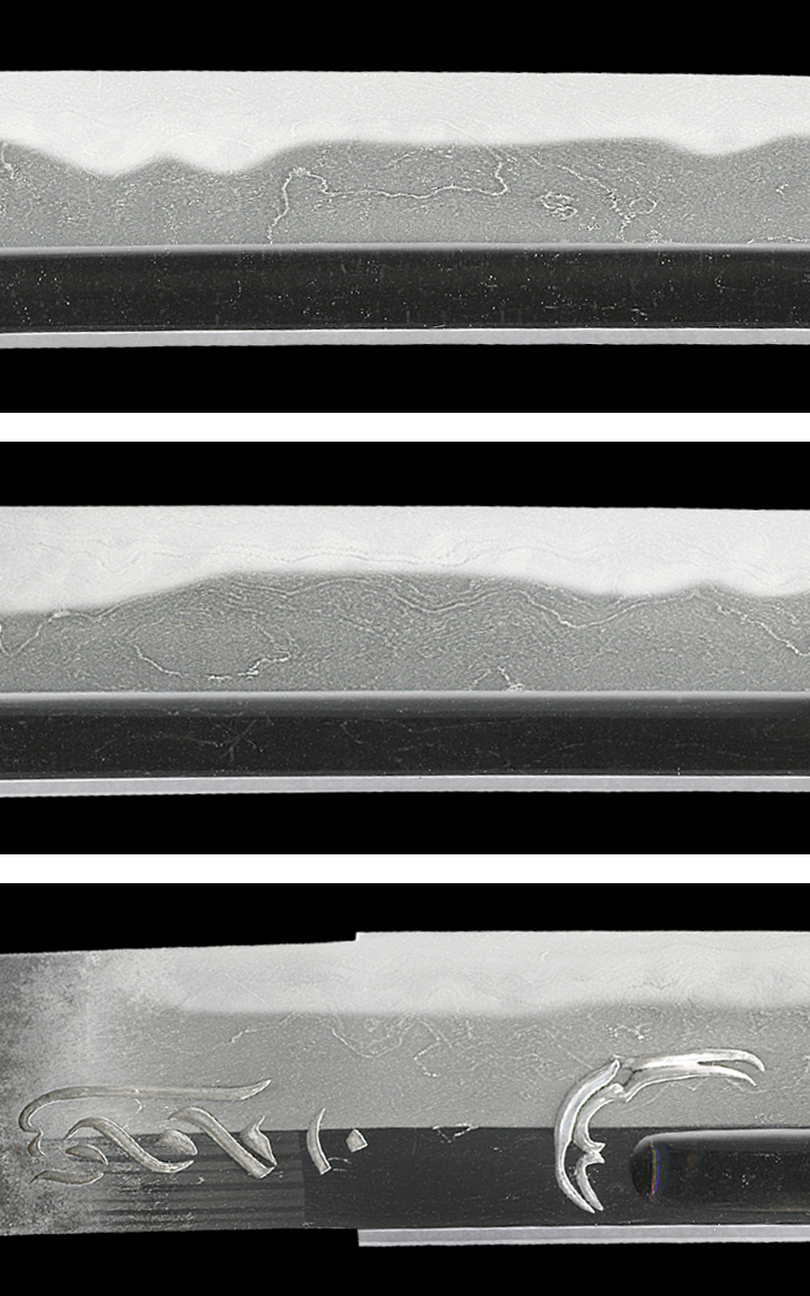 板目に杢目、流れ肌を交えた地鉄は、所々応永杢風に大模様に肌立ち、地斑状の乱れ映り立ち、互の目丁子乱れを主体の刃は、小互の目、小丁子、小乱れ交じりで、刃縁良く沸付いて明るく締まり気味となり、刃中葉、小足、丁子足繁く入り、一部金筋、砂流し掛かっています。