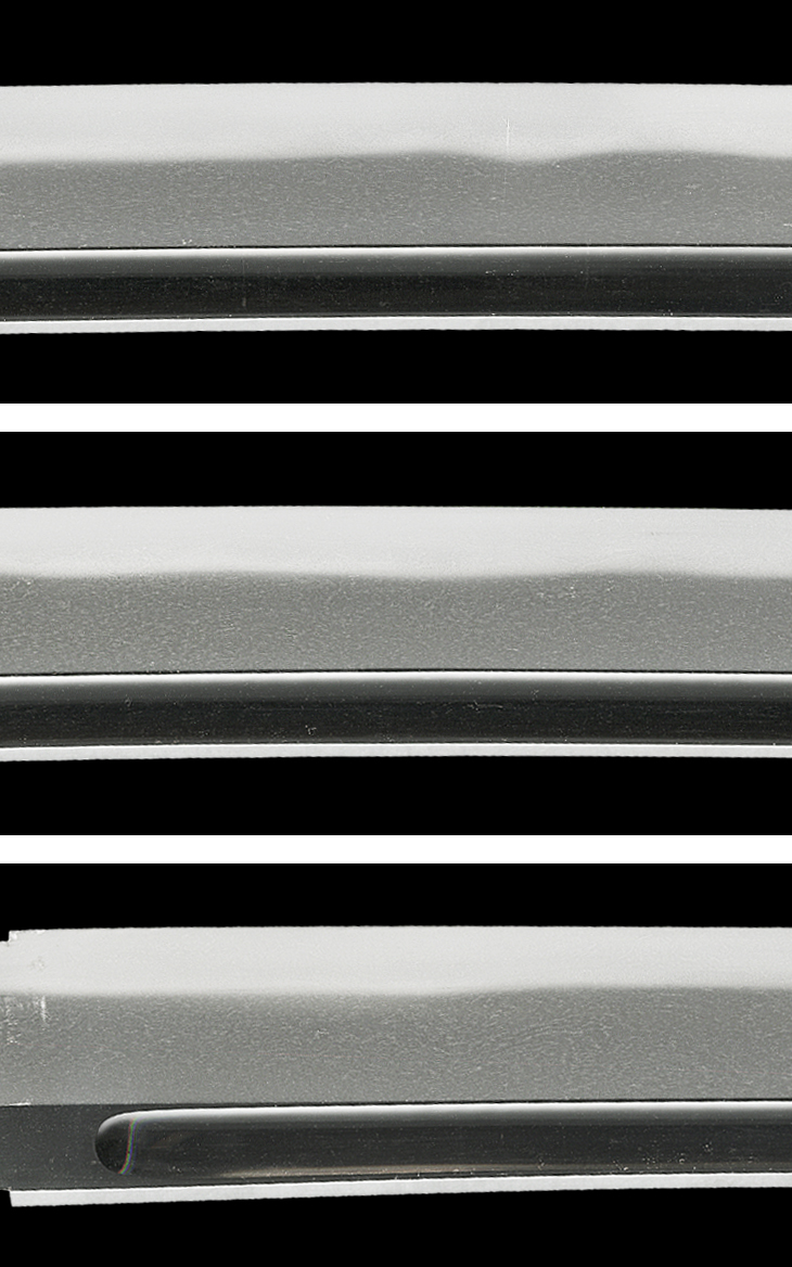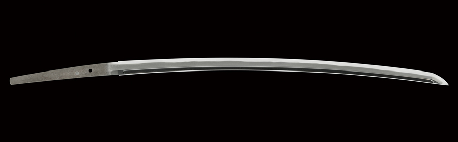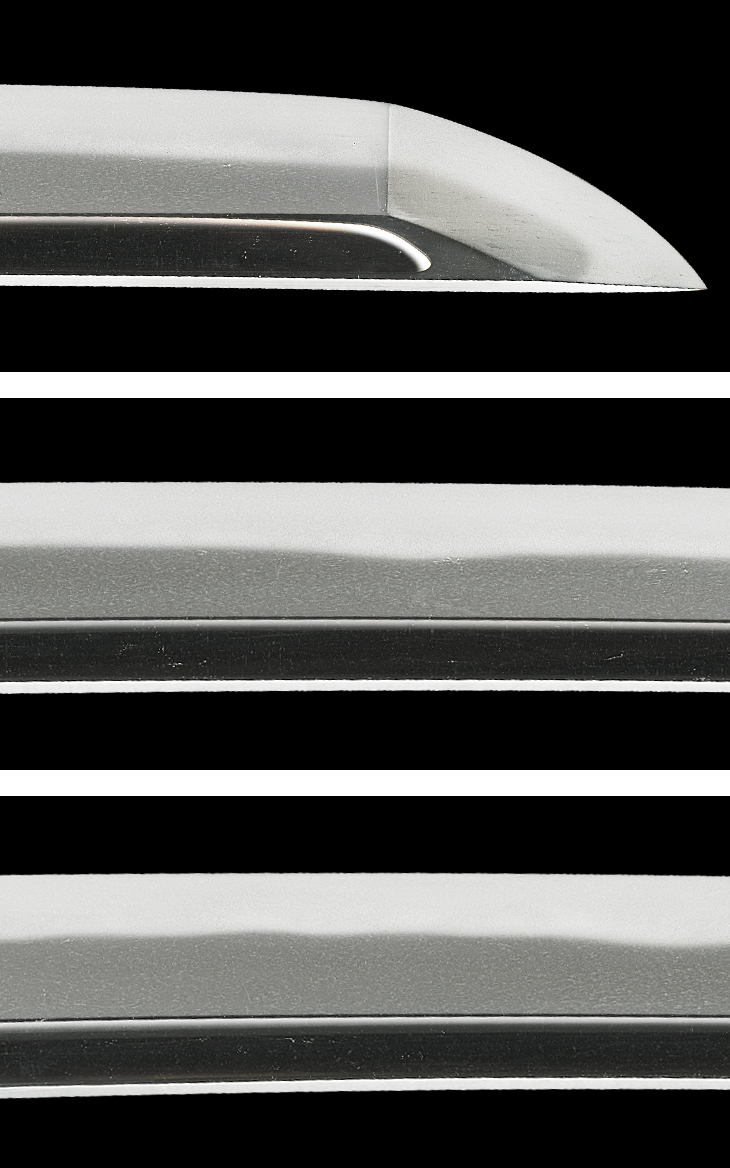 本作は、寸法二尺三寸八分強、切っ先やや延び心、鎬高く、身幅、重ねガシッとして、地刃健全な一振りです。