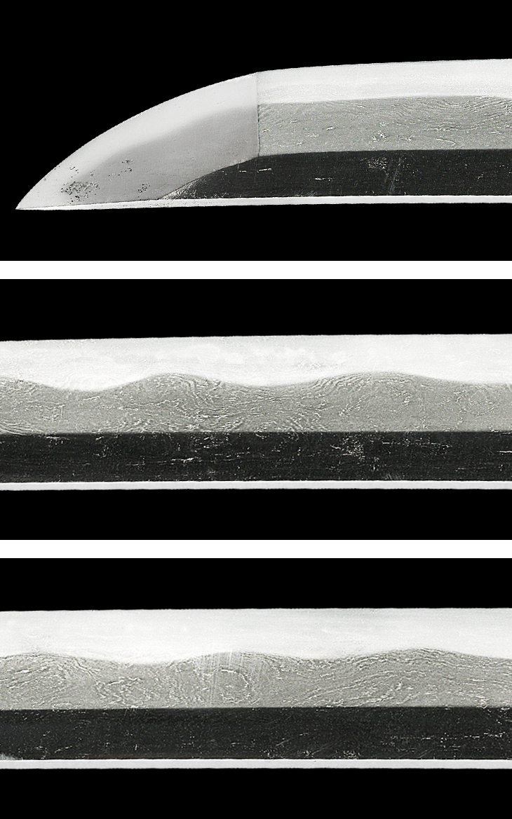 湾れ乱れ調の刃取りで、刃中丁子、小丁子、小互の目、小乱れが複雑に入り乱れる古調な刃は、長尺で重ね厚い太刀風の姿も相俟って、古備前上工を彷彿とさせるものがあります。