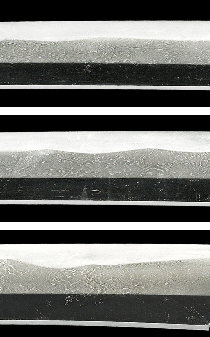 地鉄は、板目に杢目、流れ肌を交えて大模様に肌立ち、所々渦巻き状を呈するなど、同工の典型的な鉄鍛えを見せています。