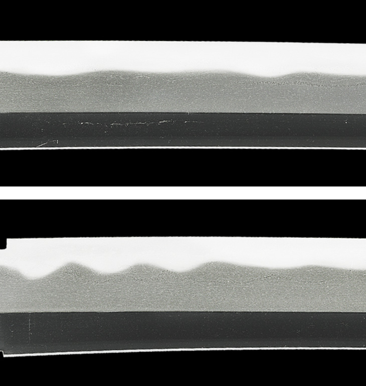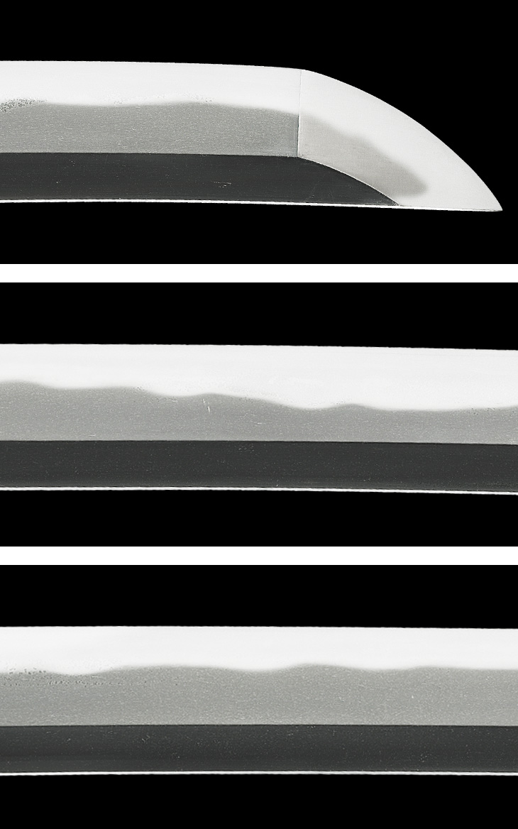 互の目に湾れ交じりの刃は、刃縁荒沸良く付いて匂い深く、やや沈み勝ちに締まり、湯走り、二重刃風の沸筋掛かり、刃中葉、小足が繁く入っており、帽子は湾れ調で焼き深く、先尖り心に返るなど、出来は相州上工、中でも左文字を思わせる覇気溢れる一振りです。
