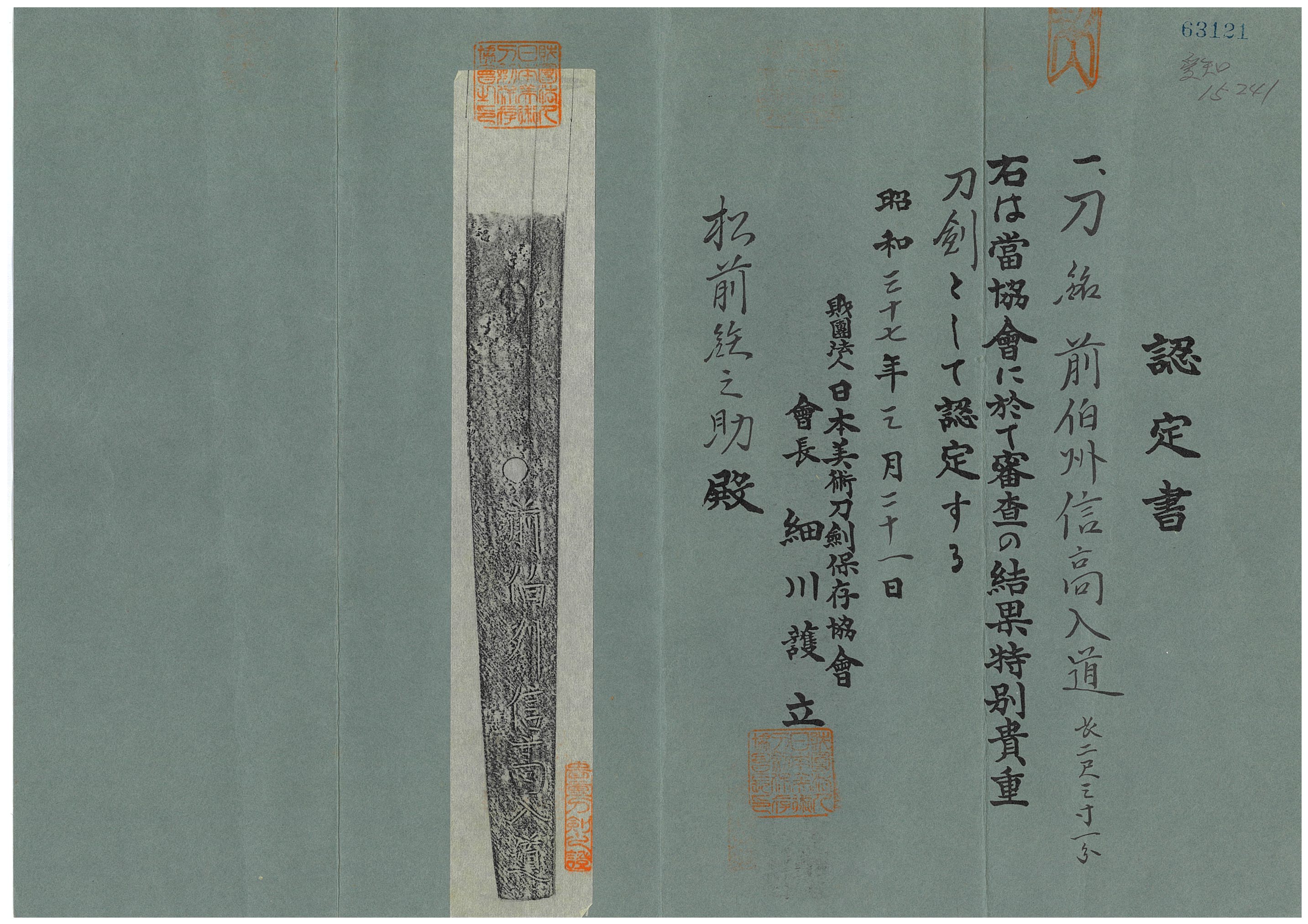銘振りは、『伯耆守藤原信高』より『前伯州信高入道』銘の方が多く、『前伯州閑遊入道』とも切ります。また二代単独銘よりも、三代との合作銘を多く見ます。