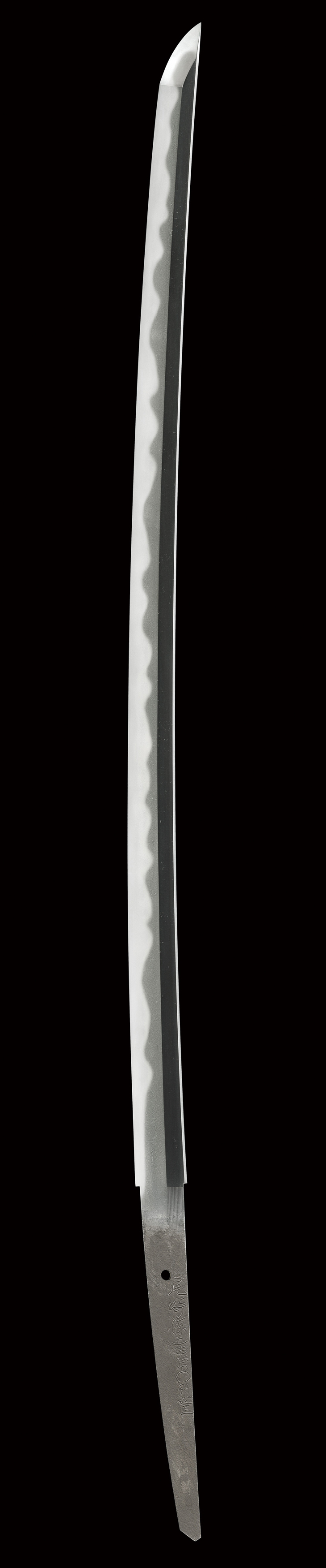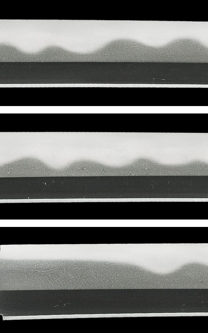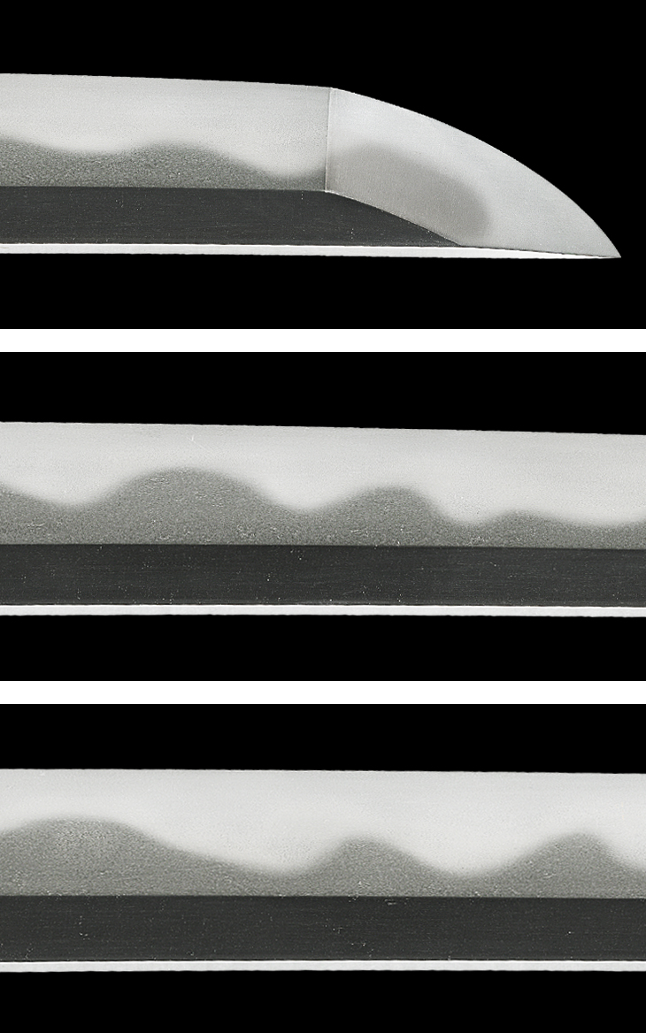 互の目乱れ主体の刃は、小互の目、頭の丸い互の目、片落ち互の目を交えて濤瀾風を呈し、刃縁良く沸付いて明るく冴え、刃中互の目足入り、一部太い沸筋掛かり、地に細かな飛び焼き掛かるなど、素晴らしい出来映えです。