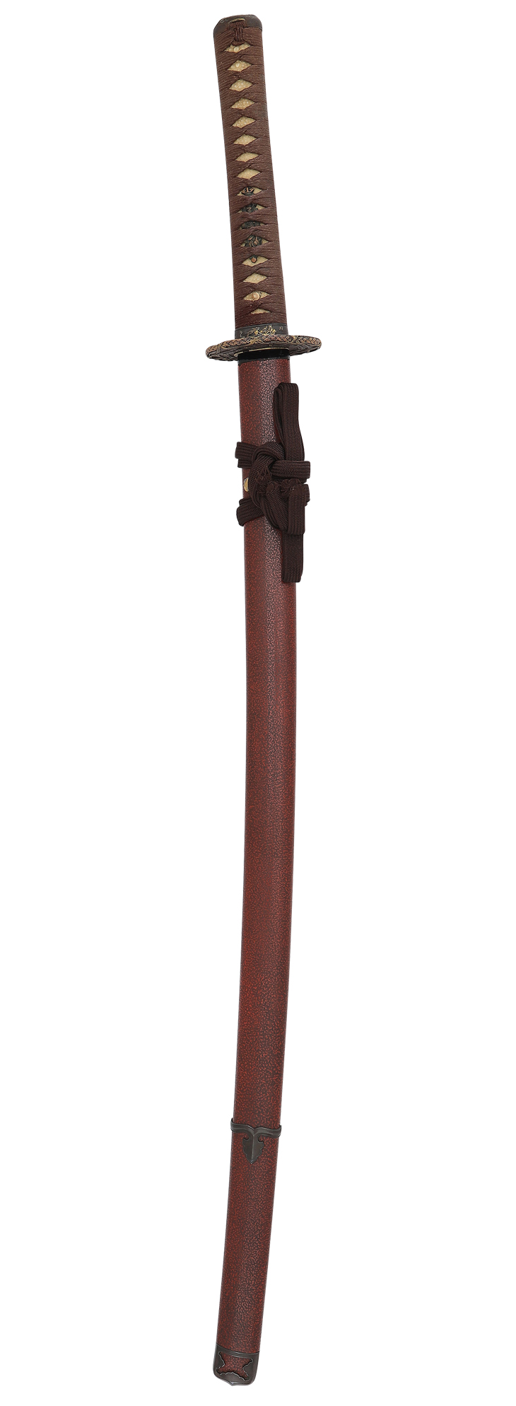 打ち刀拵え(全長102.5 柄長24.5 江戸後期 鞘 艶消し赤黒石目地 こじり、責金、四分一研磨地、無文 栗型、赤銅容彫色絵、橋下に美濃亀図 下げ緒焦げ茶 柄 親鮫に焦茶柄巻き 縁頭、鉄地据え紋象嵌色絵、砂潜り龍図 目貫、素銅地容彫、剣巻龍図 鍔 信玄風鍔 鉄地撫木瓜形真鍮糸巻き図)付き。