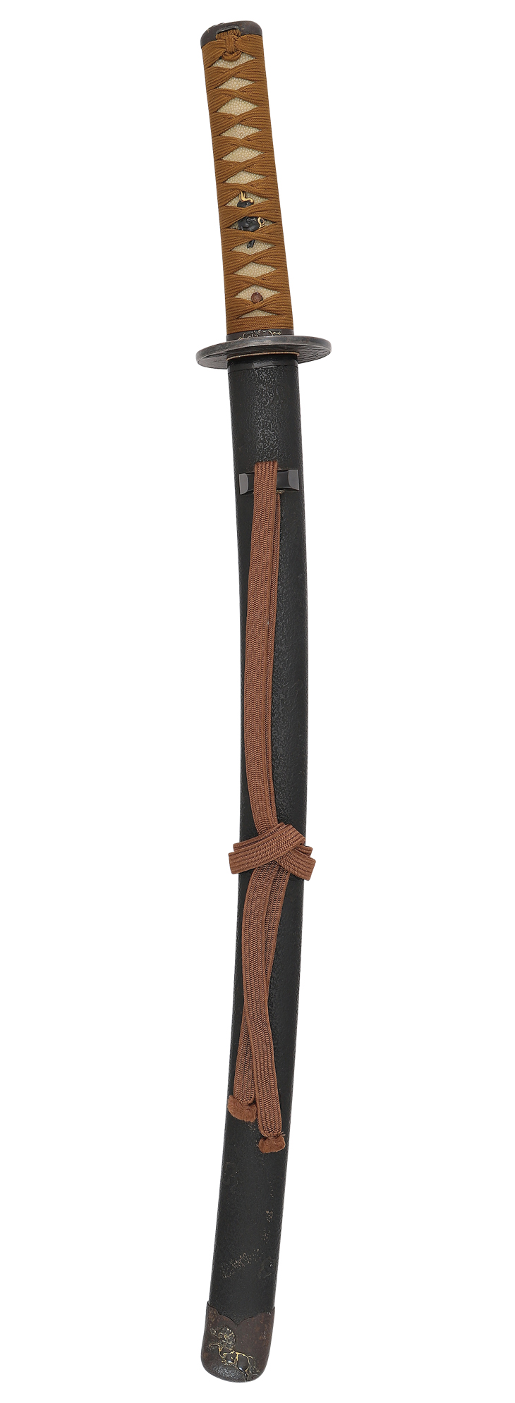 脇差拵え(全長75 江戸後期 鞘 黒石目塗 こじり、鉄地鍬形据文象嵌色絵、馬と鞭の図 小柄、赤銅容彫金銀色絵、馬の図 下げ緒、焦げ茶色 柄 鮫に茶柄巻き 縁頭肥後、鉄地鋤出彫、縁金色絵、馬の図 目貫、赤銅容彫色絵、馬図 鍔 鉄地丸形鋤下彫、目に金色絵、馬図)付き。