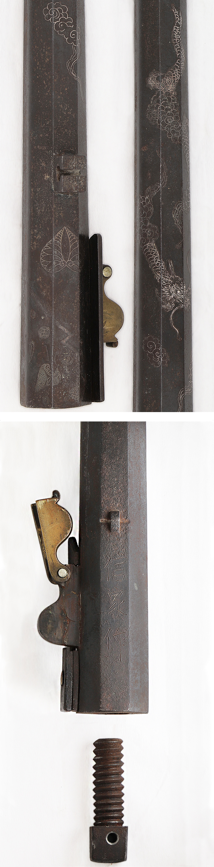 銃身の上面全体に雲龍図の銀象嵌が入っています。