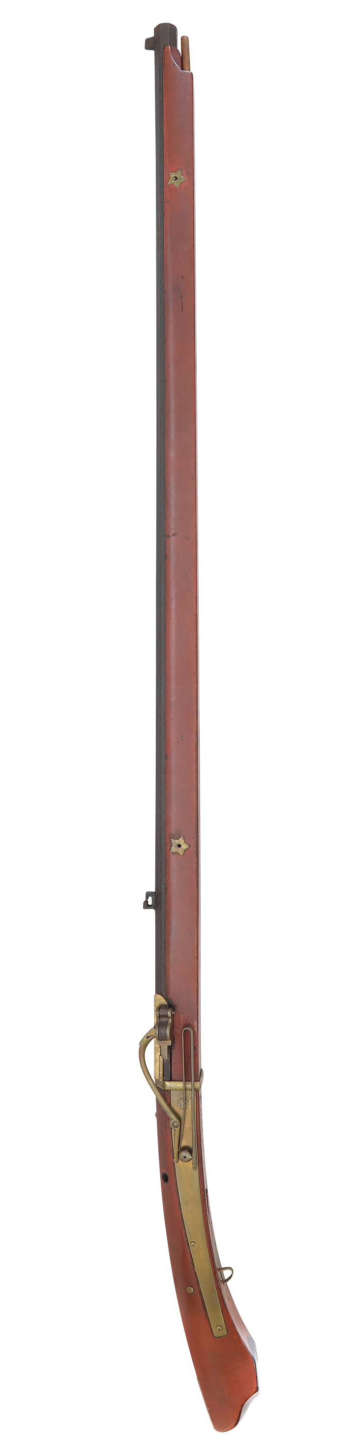 この火縄銃は、無銘の細筒で、銃身は八角銃身で、柑子はなし、先目当:三角、元目当:筋割、鉄味良くきれいに作られています、また外カラクリは動き、カルカありで尾栓も外せます。(演武に使 うなら尾栓の修理をオススメします。) 銃床部の木部には漆が塗ってあります。また、飾り金具がありますが絵柄がすり切れていて、何の図なのかはわかりません。