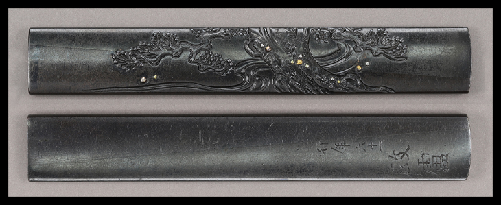 この小柄は、四分一削継で僅かな色の濃淡を出し、大胆で見事な鏨使いで老木を描いた心憎い粋な作です。