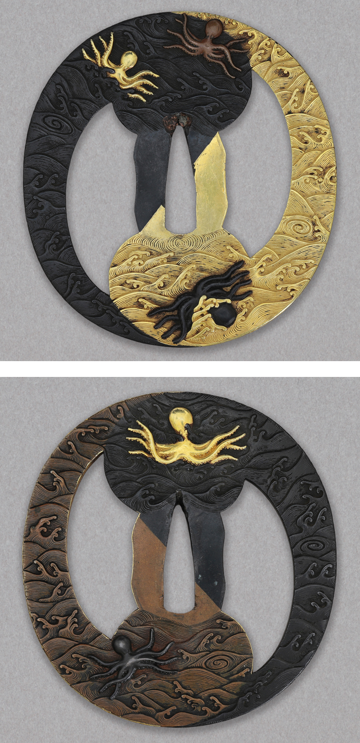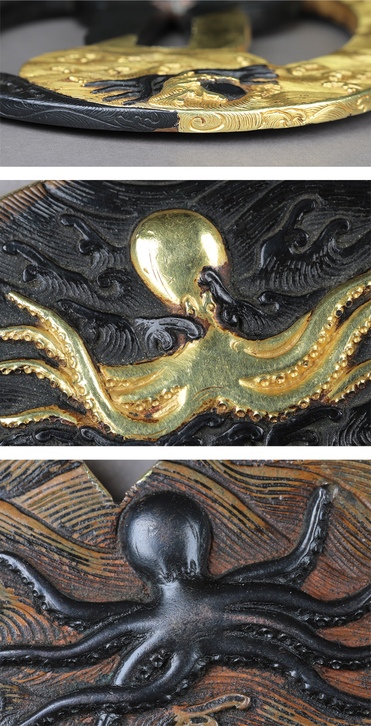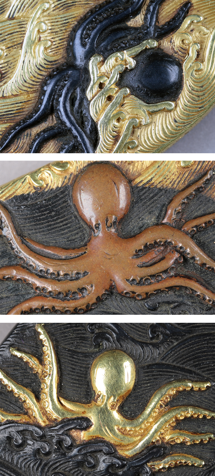 地は鋤出彫と毛彫で荒波文様を描き、表は金と赤銅、裏は赤銅と素銅、巴透に合わせて美しく象嵌ざれています。その荒波の中には、金、赤銅、素銅の蛸が踊っています。