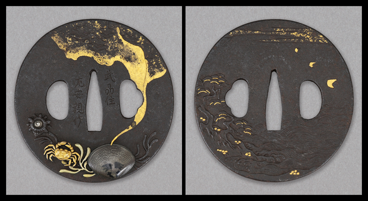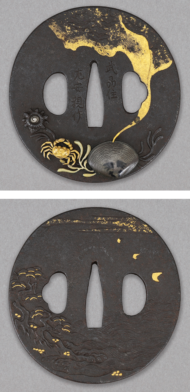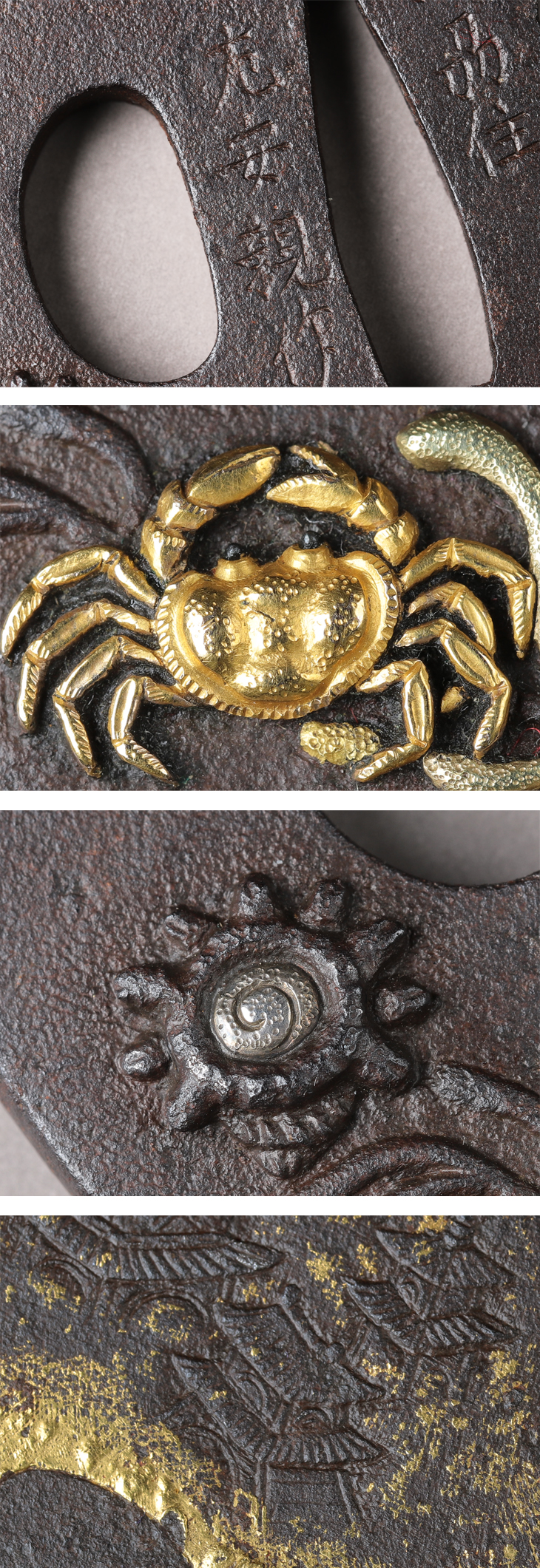 大蛤から吐き出される息から蜃気楼は現れるとの伝説を題材とした鍔です。彫象嵌共丁寧で面白い出来栄えの作となっています。
