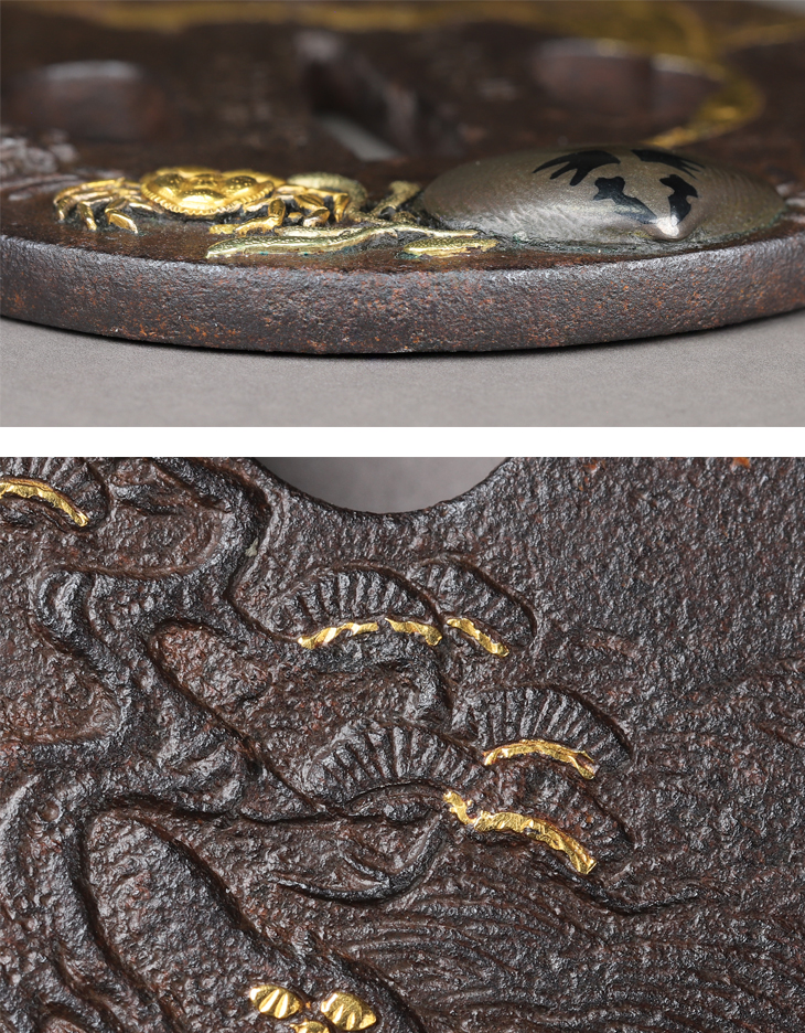 鉄石目鑚地鋤出高彫 象嵌色絵 金布目象嵌