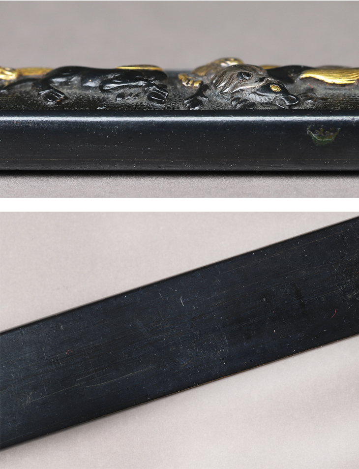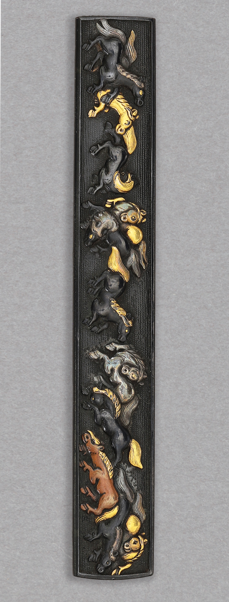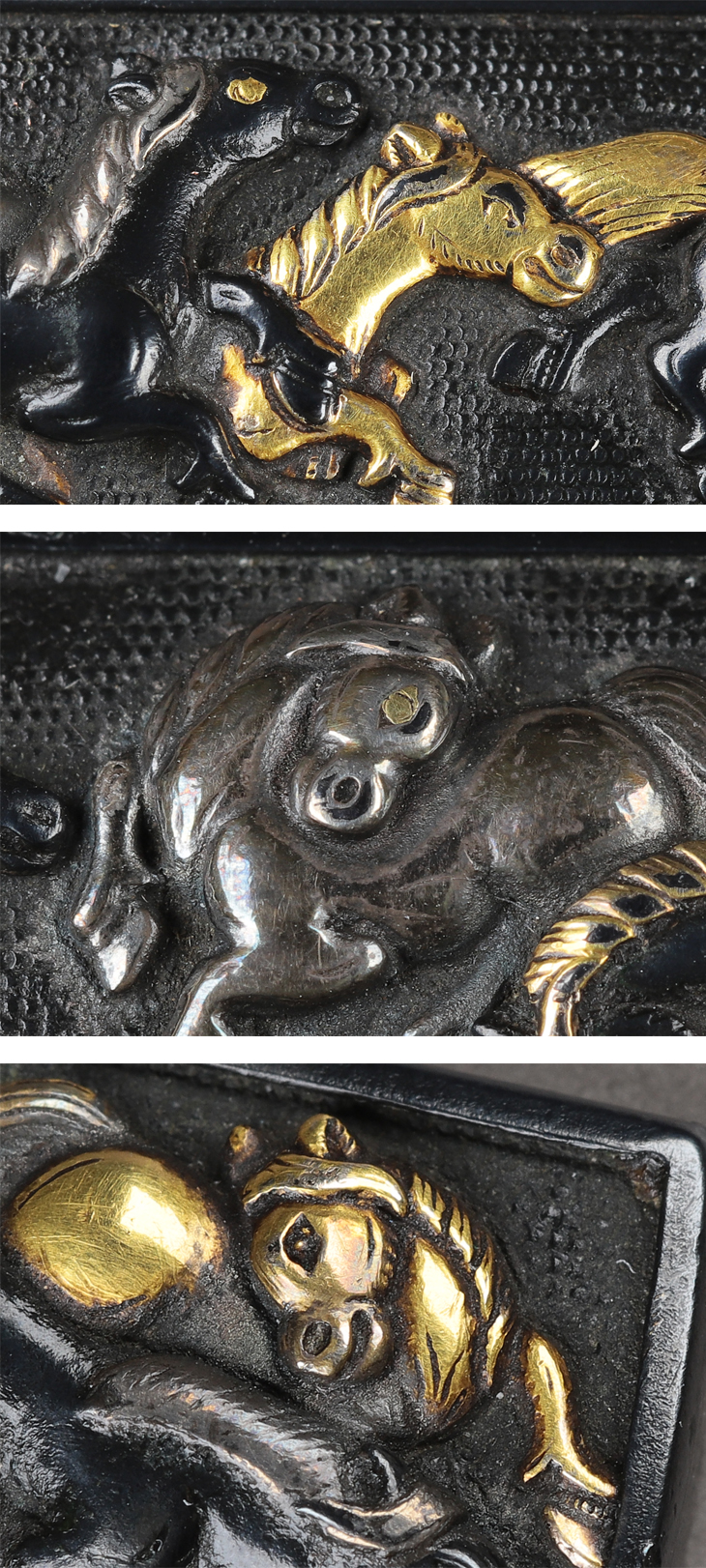 十一匹の馬の姿態が実に上手く描かれた、彫、象嵌共に上手く、楽しい小柄です。