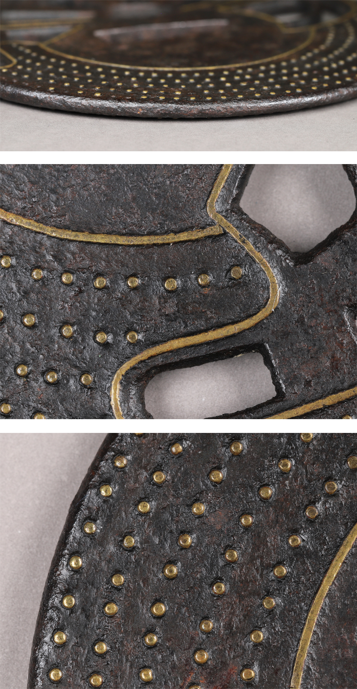 応仁鍔とは、室町期に始まる、主に薄手の鉄に真鍮地で点象嵌、線象嵌されたものを言います。