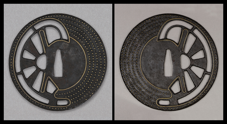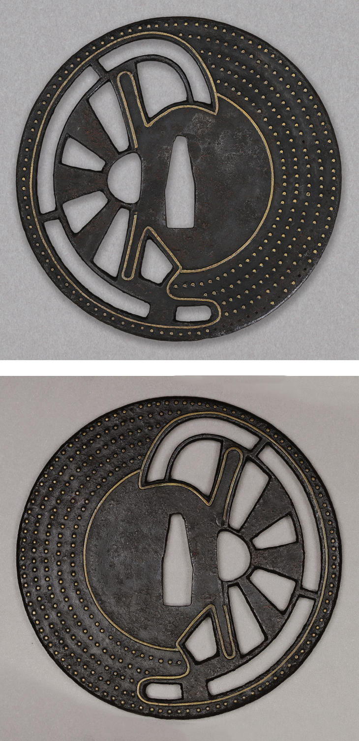 この鍔は、大ぶりな丸形の片側に車輪が透され、片側は無数の点象嵌が施された素朴でおおらかな作です。