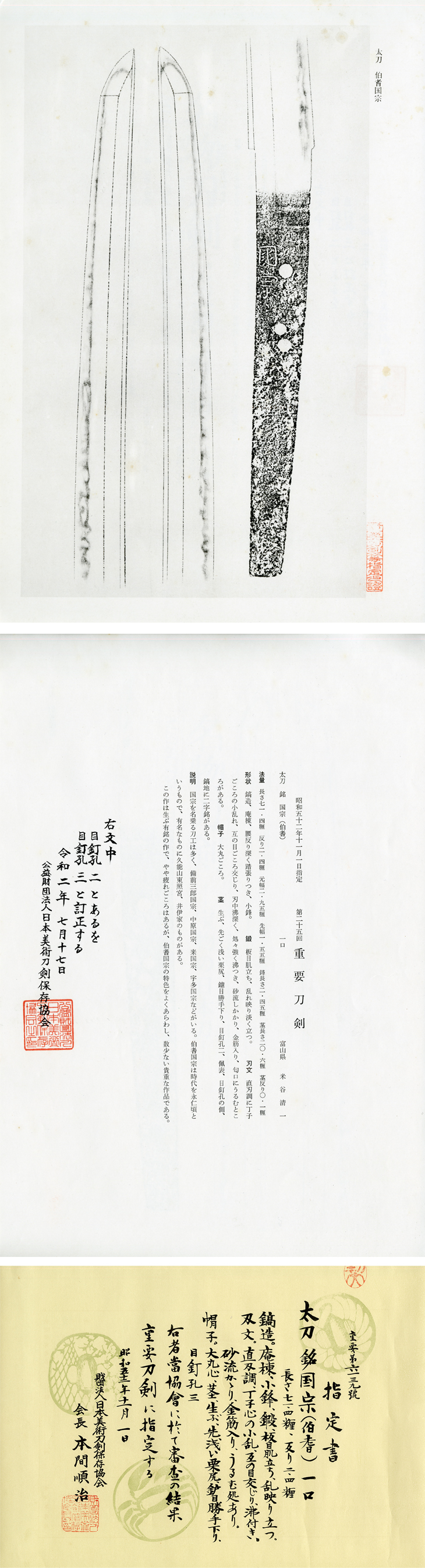 図譜では、『国宗を名乗る刀工は多く、備前三郎国宗、中原国宗、来国宗、宇多国宗などがいる。伯耆国宗は、時代を永仁(一二九三~九九)頃と云い、有名なものに久能山東照宮、井伊家に伝来する太刀がある(共に重要文化財)。』とあり、鎌倉後期の作としていますが、日々抄には、『佩表、茎上段棟寄りに行書体に近い二字銘があり、三郎国宗の銘に一見似ているが、細部異なる。この手の国宗を、世に三郎国宗の門下で 伯州在住の者と伝えているが、必然的ではなく、むしろ作風が三郎よりも古調である。』とあります。