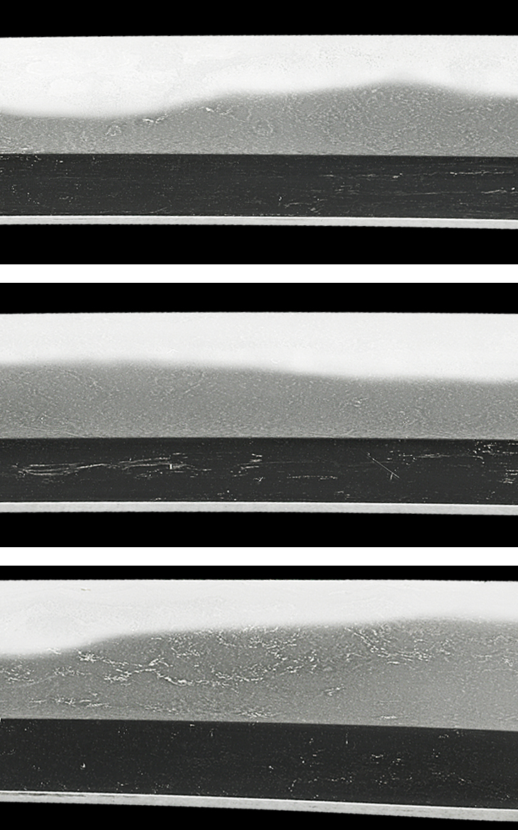 作風は、古備前物に近い小乱れ主調の刃を焼きますが、仔細に見ると、鉄に黒みがあり、地景、地斑を交え、随所に板目が大模様に肌立ち、焼き刃も刃縁潤み心に金筋、砂流しが頻りに掛かり、小互の目、小湾れが目立って交じるなど、古備前に比して一段と野趣のある出来が特徴と言えます。