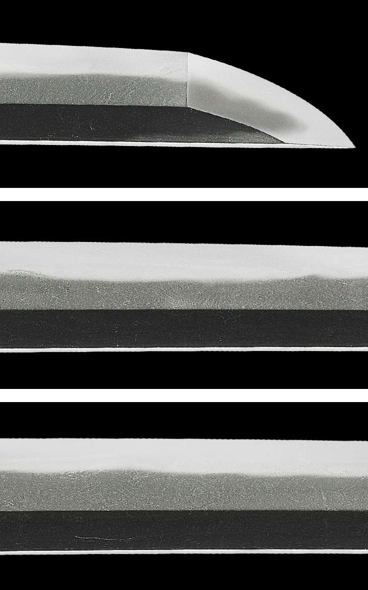 板目に杢目交じりで良く詰んだ良な地鉄は、所々流れて肌立ち、地景繁く入り、僅かに飛び焼き交じり、直湾れ調で小互の目交じりの刃は、刃縁明るく冴え、打ちのけ、湯走り、喰違刃掛かり、刃中葉、小足良く入り、金筋、砂流し掛かっています。