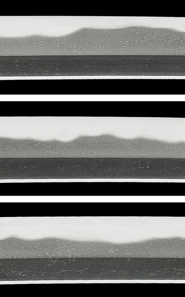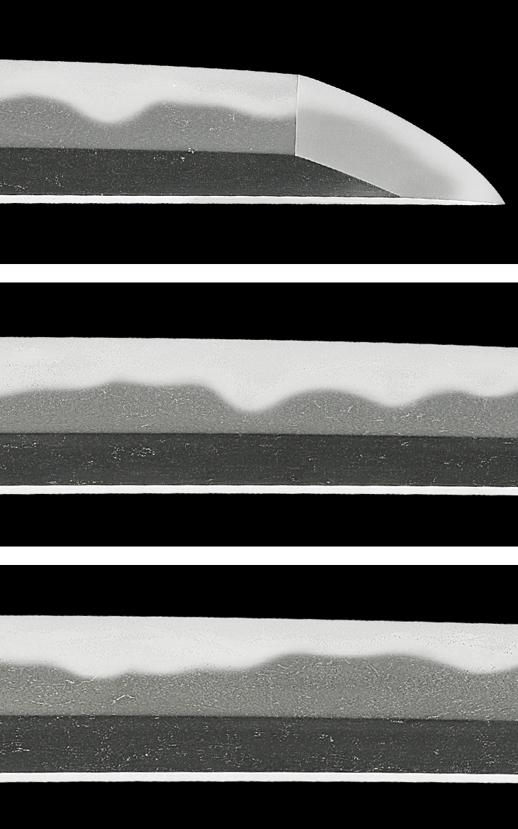 小板目に板目、杢目、流れ肌を交えて総体的に詰んだ地鉄は、所々うねるような地景を交えて大模様に上品に肌立ち、互の目に小互の目、尖り風の刃を交えた刃は、刃縁明るく冴え、筋状の湯走り掛かり、一部二重刃風を呈し、刃中金筋、砂流し、太い沸筋が烈しく掛かっています。帽子も先が突き上げ気味に尖って掃きかけ返るなど、普段の志津と言うより、正宗の作風に寄せた出来と言えるでしょう。