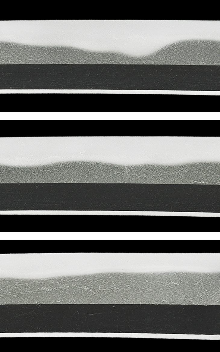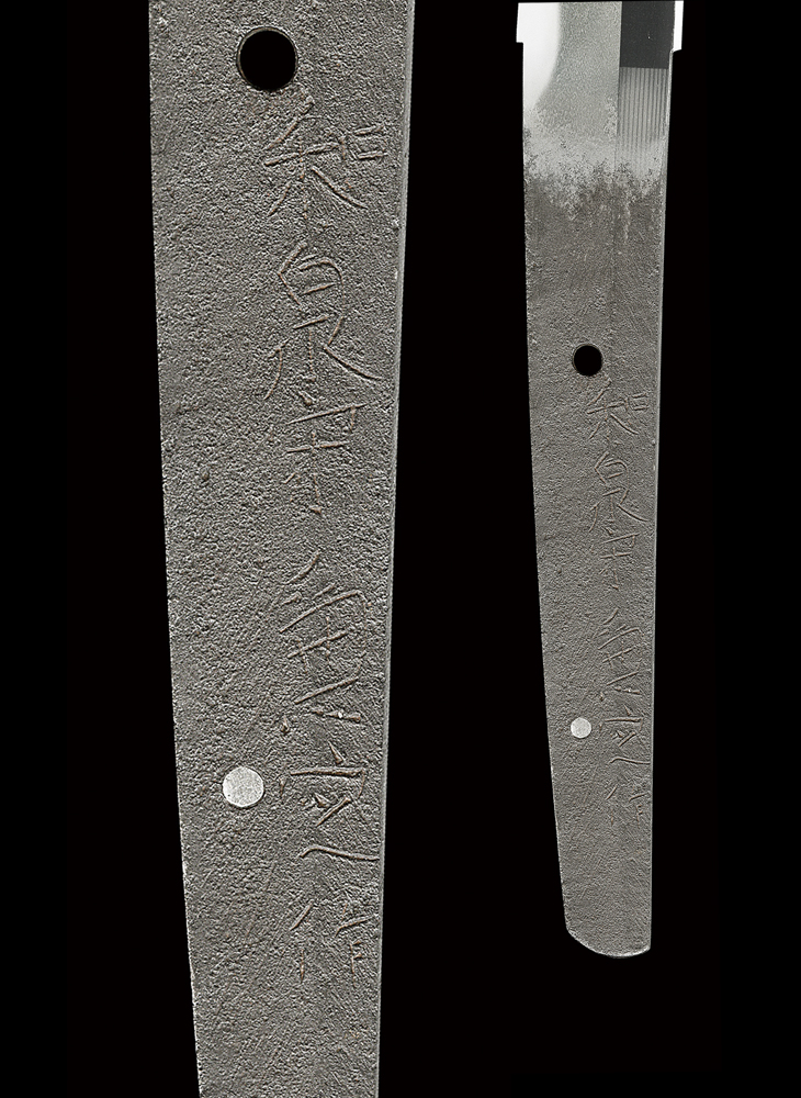 銘振りは、最初『濃州関住兼定作(造)』と切り、明応十年(一五〇一)頃までは、『定』の字を楷書で切ります。それ以降『之定』銘となり、永正七年(一五一〇)頃に『和泉守』を受領、以降『和泉守(藤原)兼定作』と切ります。短刀の場合、『兼定』二字銘が圧倒的に多く見られます。鑢目は刀、脇差しは鷹の羽、短刀は檜垣、茎尻は栗尻ですが、後期晩年作になると、どの寸法でも鑢目は筋違い、茎尻は尖って入山形、剣形風になります。