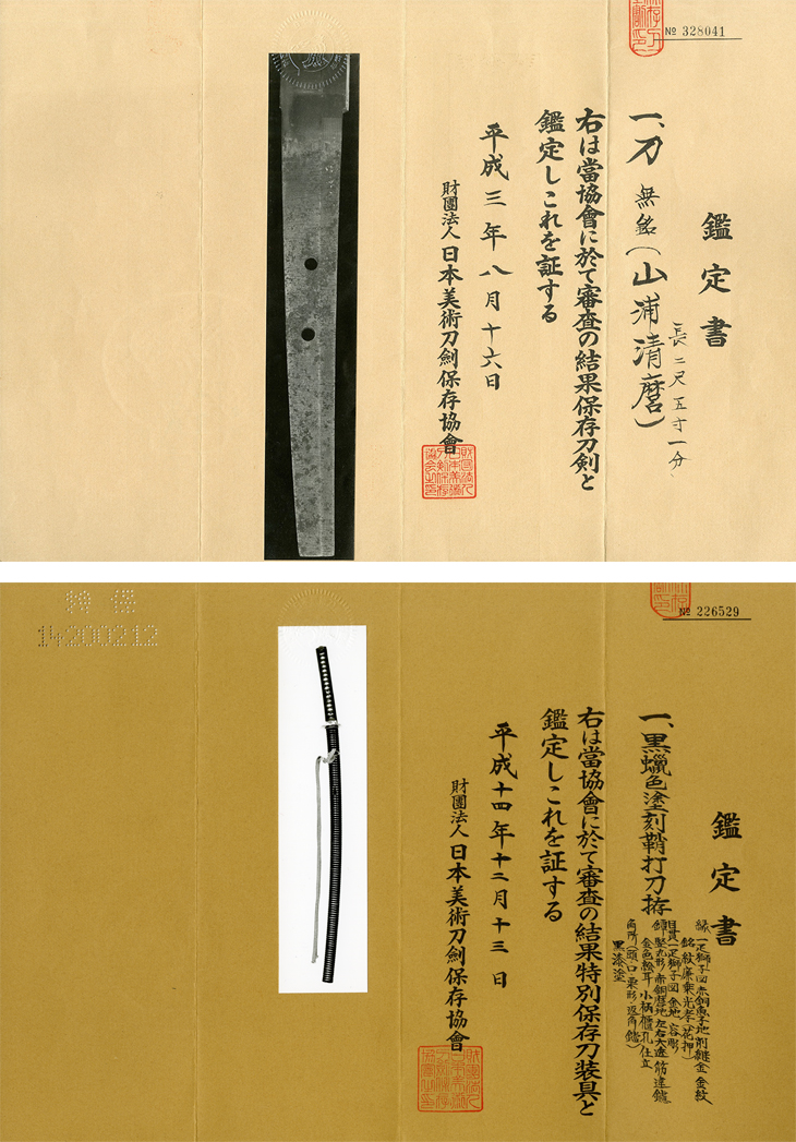昭和二十六年の古い登録証は、兵庫県登録の第『七九四』号、付属の外装も、刻みの綺麗な鞘で、特別保存刀装具鑑定書付き、縁は廉乗極めの赤銅獅子、赤銅鐔は吉岡風の海鼠透かし、目貫も金無垢獅子等々、江戸期の大変立派な作、外装のみでも相当な価値です。