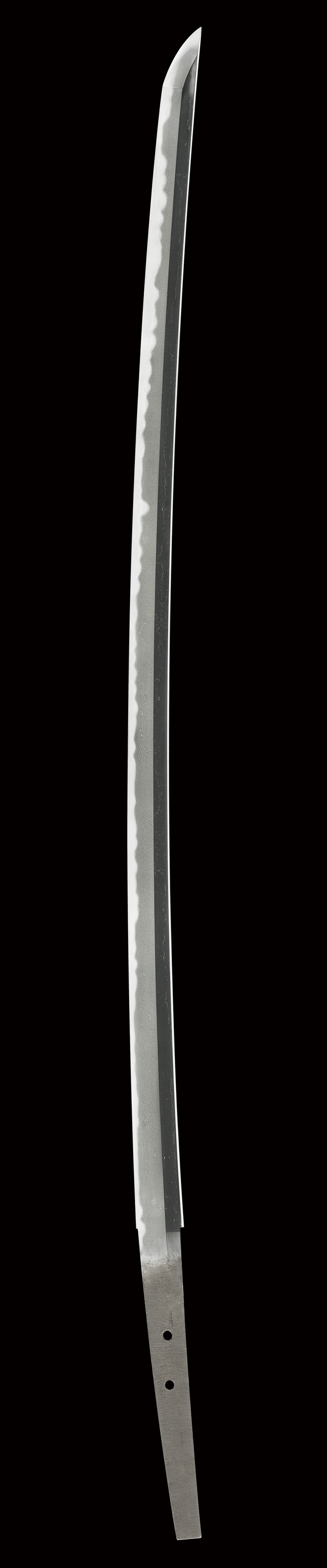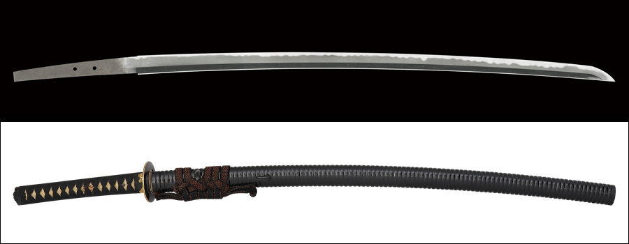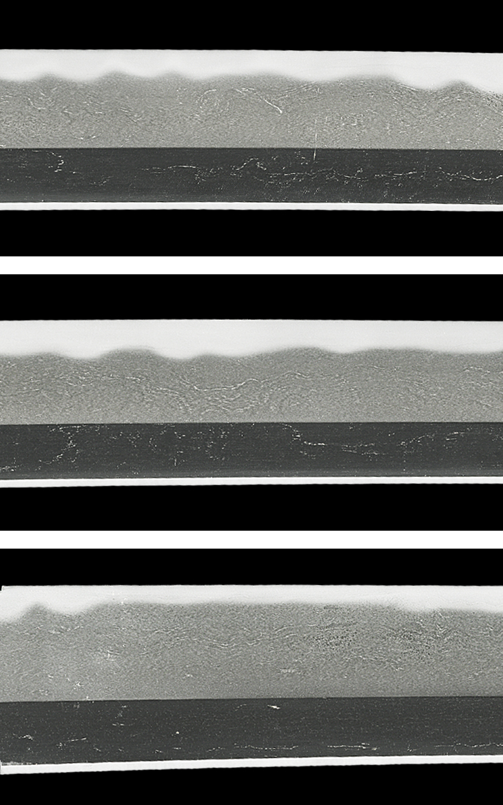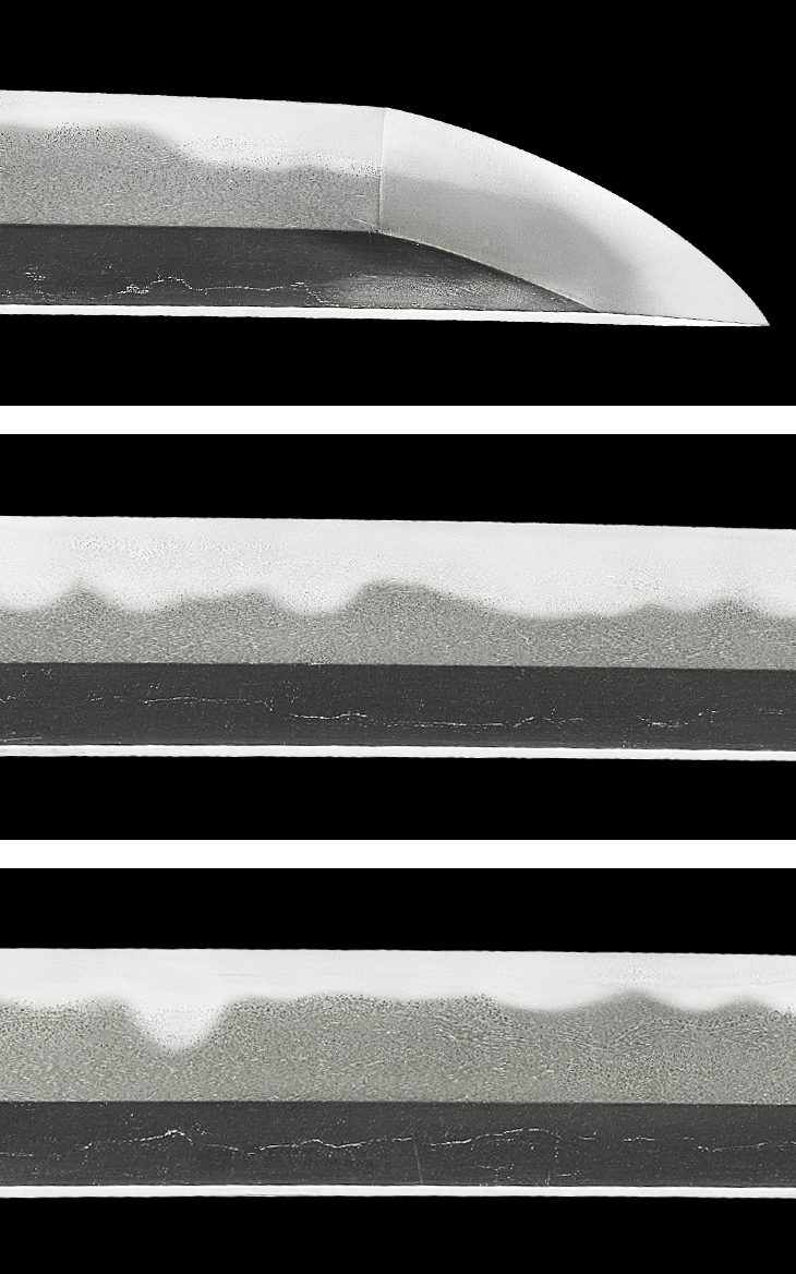 板目に杢目交じりの地鉄は、総体的に流れ心で上品に肌立ち、地沸厚く付き、地景繁く入り、互の目乱れ主体で、大互の目、小互の目、尖り風の刃を交えた刃は、刃縁荒沸付いて匂い深く明るく冴え、筋状の湯走り掛かり、刃中互の目足入り、金筋、砂流し頻りに掛かり、帽子も烈しく沸付き、先掃き掛け長く返っています。