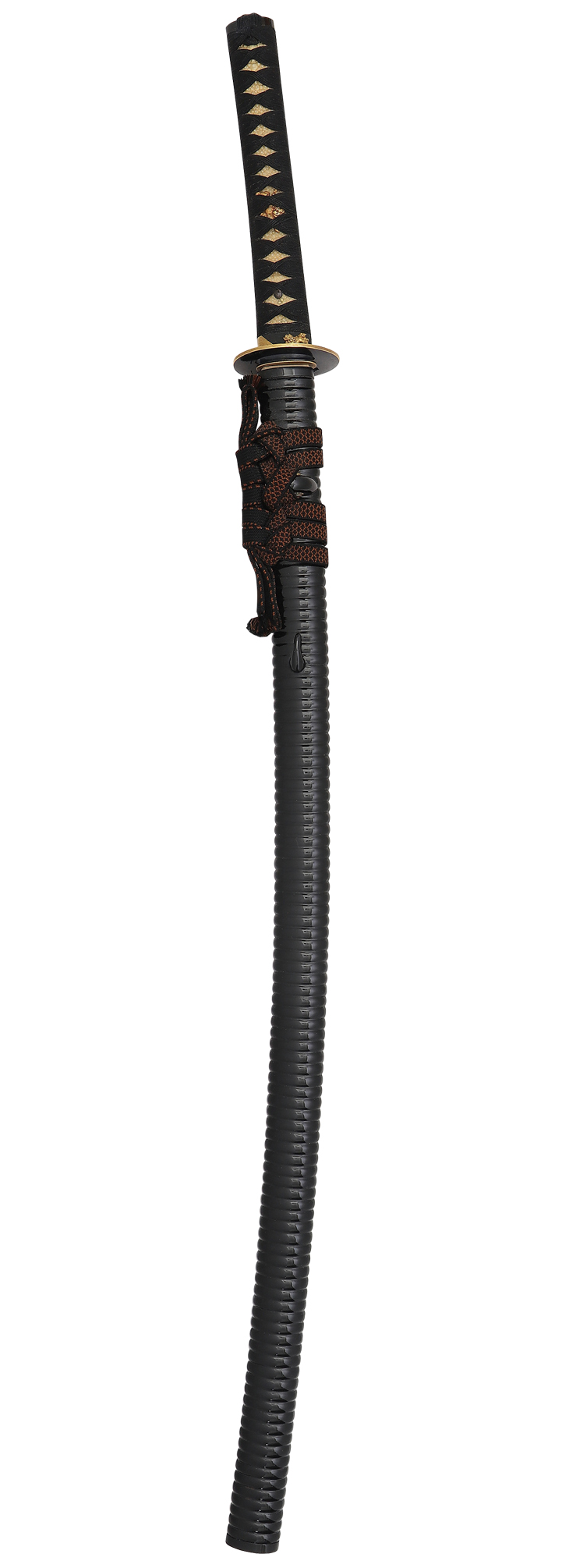 打ち刀拵え(全長106 柄長24.5 江戸後期 鞘 黒の呂の刻み鞘 返り角あり 下げ緒、黒と小豆色 柄 親鮫に黒蛇腹巻き 縁、銘、紋簾乗 光孝花押 赤銅魚子地に金削ぎ象嵌、一疋獅子図 目貫、金無垢地容彫、獅子図 鍔 赤銅研磨地、海鼠透 金覆輪)付き。