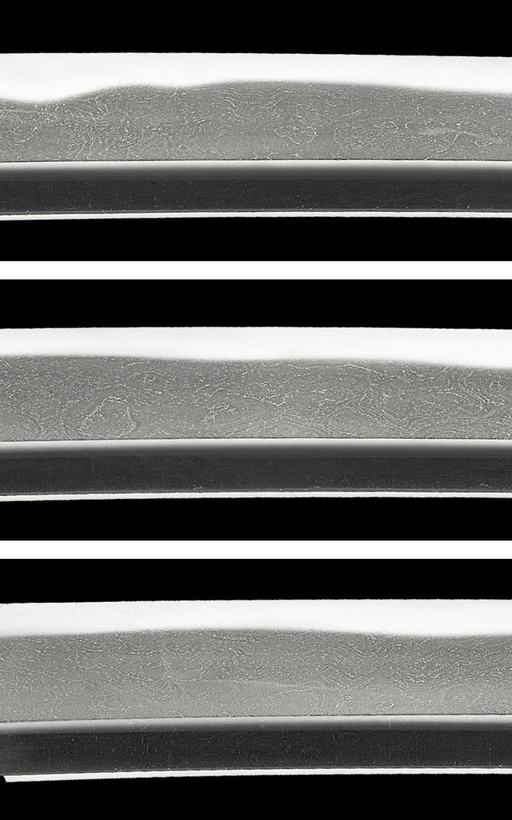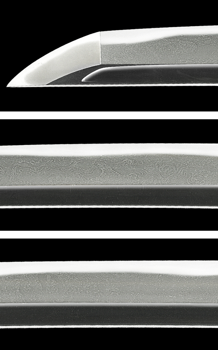 板目に杢目、流れて肌を交えた地鉄は、地景繁く入り、良く錬られて潤いがあり、湾れ調で小互の目交じりの刃は、刃縁良く沸付いて匂い深く明るく冴え、刃中小足、小互の目足入り、金筋、砂流し頻りに掛かるなど、一見して分かる鉄質の良さ、鍛錬の良さ、刃中に光の強い荒沸が付いて太い金筋がうねるように掛かる様は、師正宗風を良く継承しています。