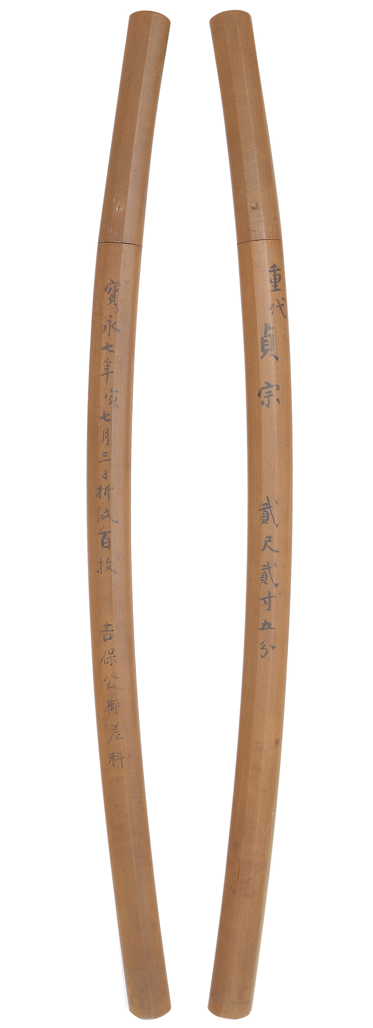 後に本阿弥光春(一七一九~七八)こと、本阿弥次郎左衛門永清が再鑑定した折紙も附帯しており、『お刀を改めて拝見したところ、現在では五百枚の価値はあろうかと思われる見事な出来。』とあります。 加えて探山先生鞘書きにもあるように、本刀は大和国郡山(こおりやま)藩主柳沢家に伝来した由緒正しき一振りです。