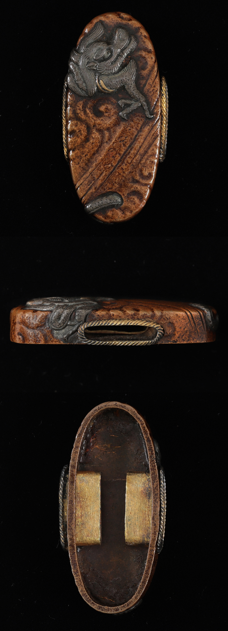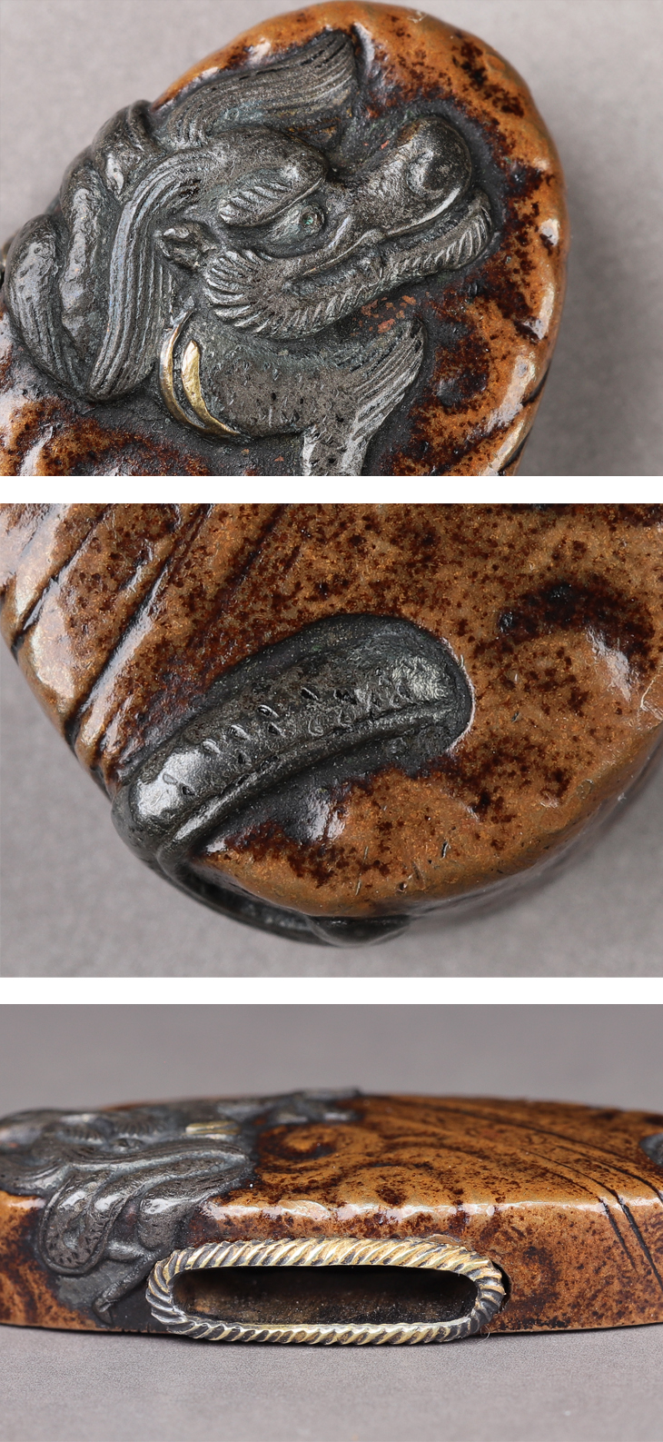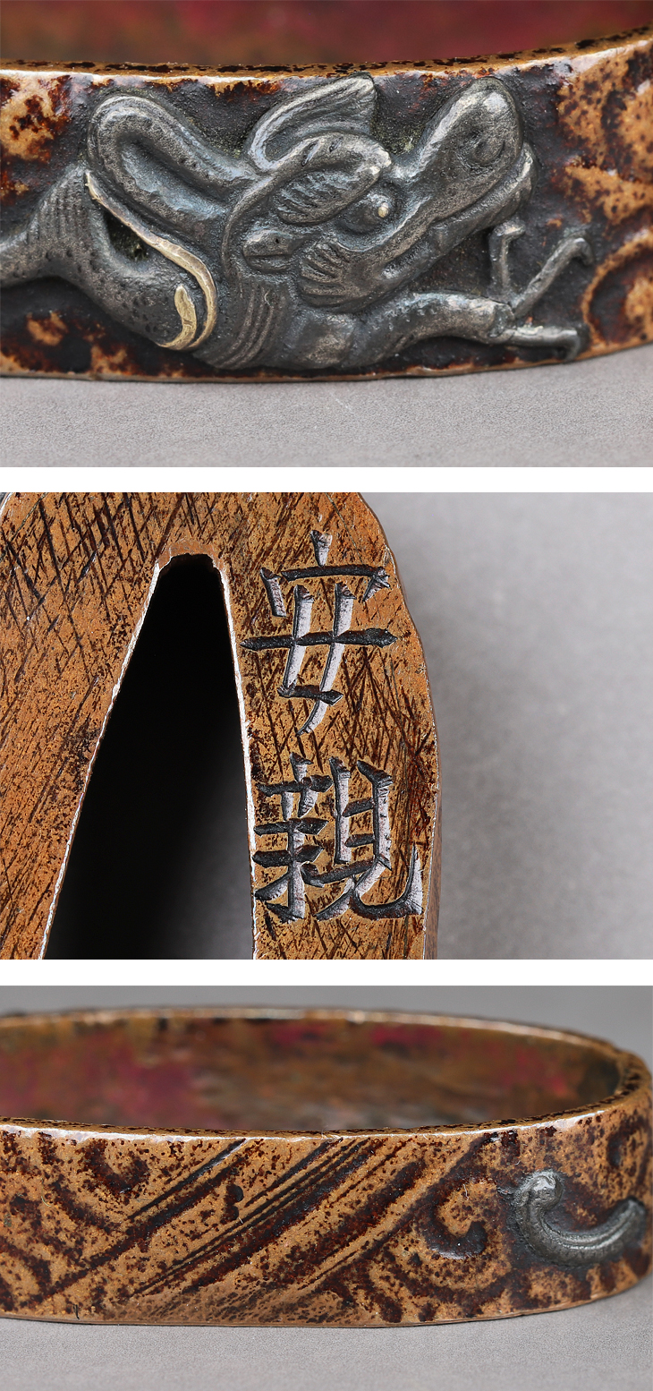 この縁頭は、素銅石目地に鋤出彫を用い、縁頭の狭い面積に雲龍を見事に彫り上げている。随所に安親の巧みな技法が看取でき、力強い作品となっている。」