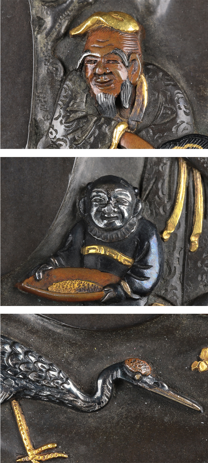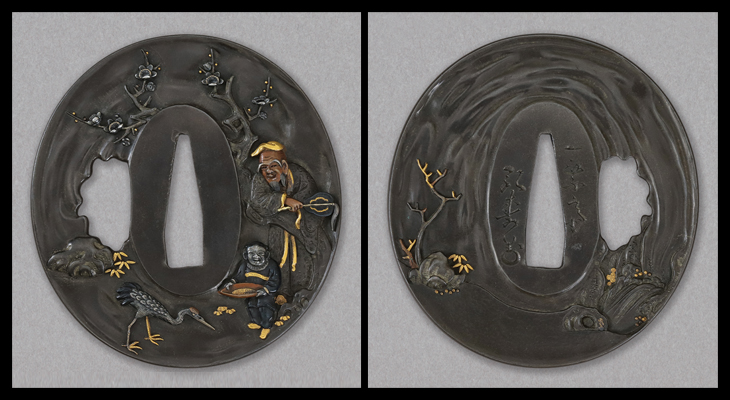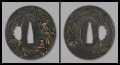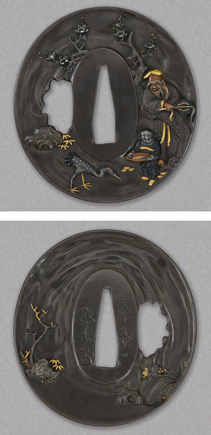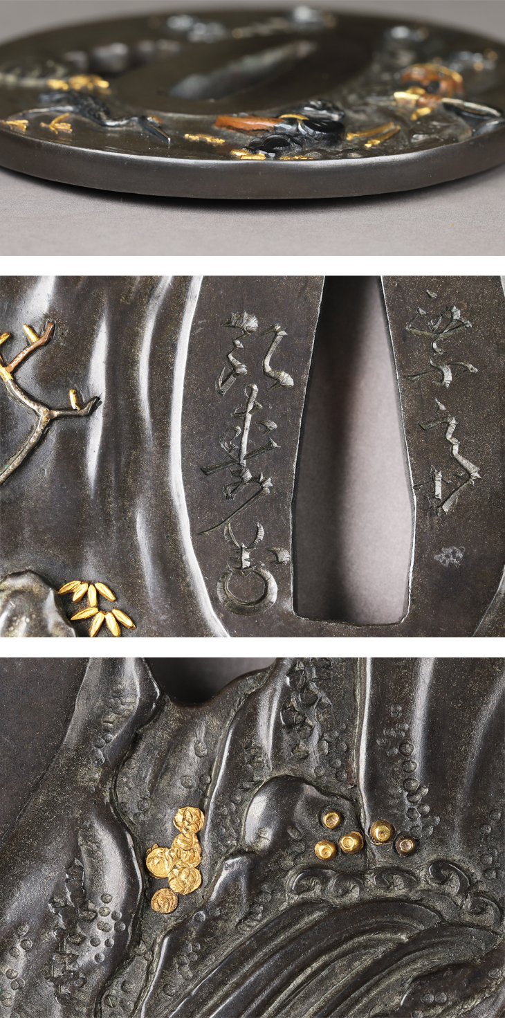 この鍔も弘寿の力量を見せつける一作、四分一研磨地に動きを見せ、その中に施された鋤出高彫、象嵌色絵は一種独特な趣を醸しています。