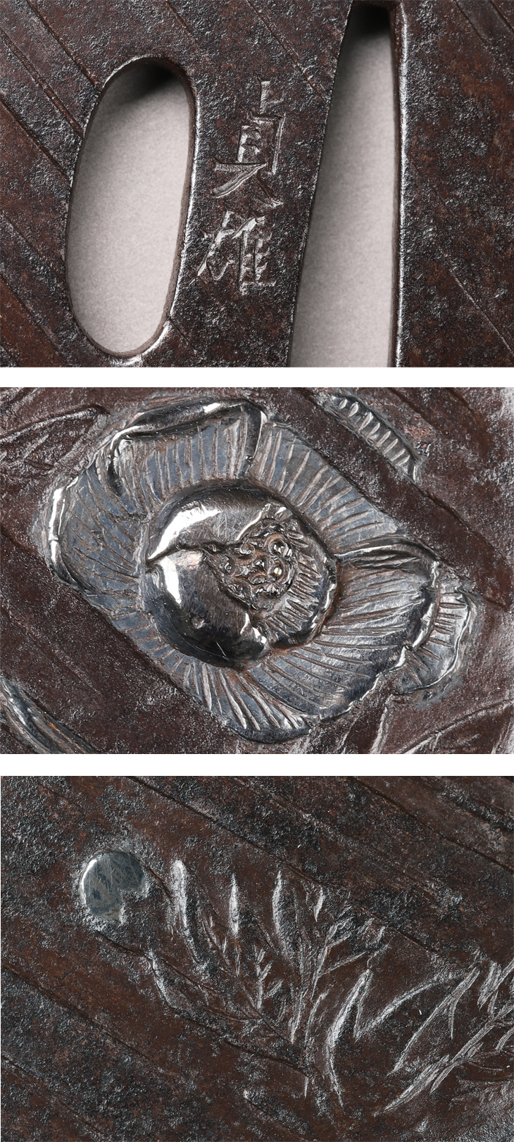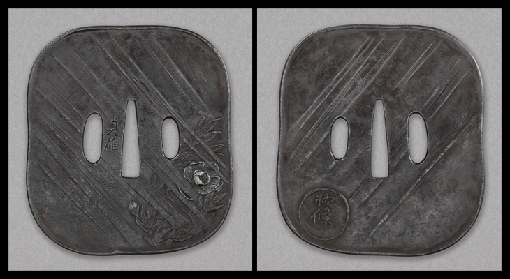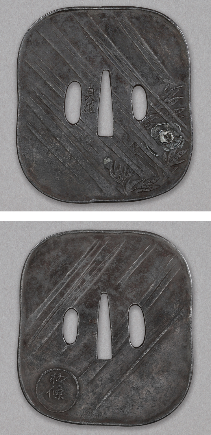 この鍔も、夏雄によく見られる角形を歪めた変わり形、激しい驟雨、風になびく牡丹、夏雄の牡丹図を思わせる出来栄えです。