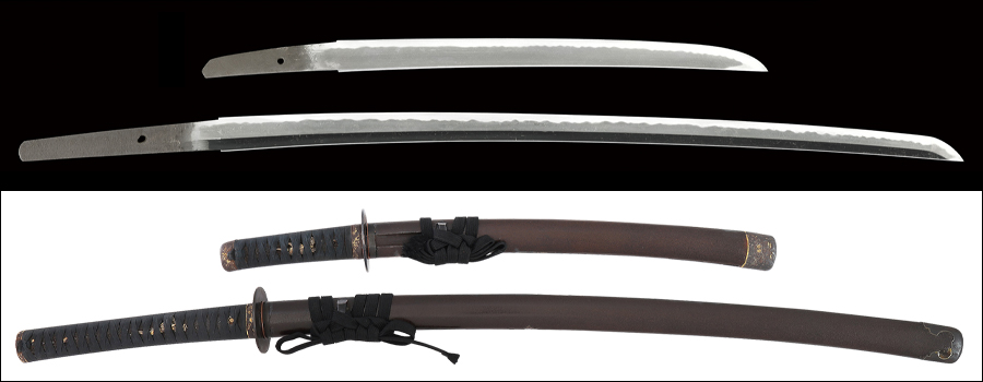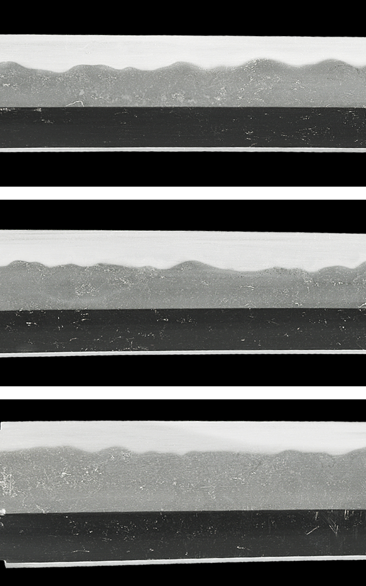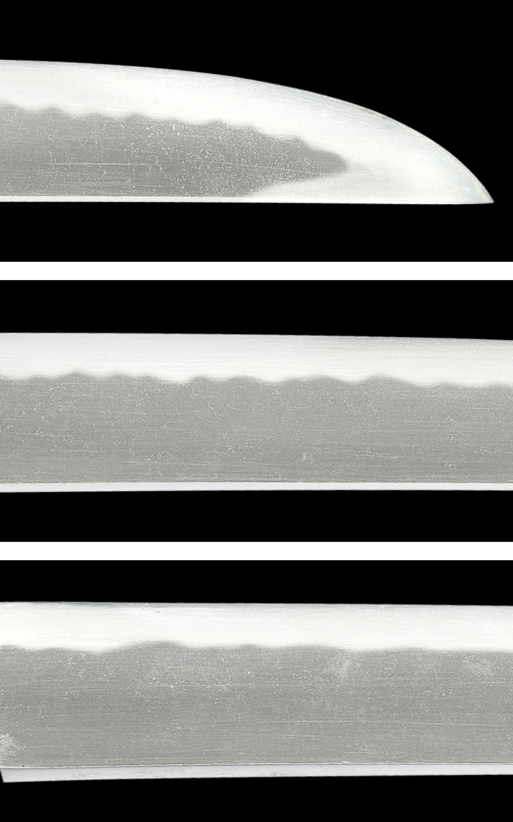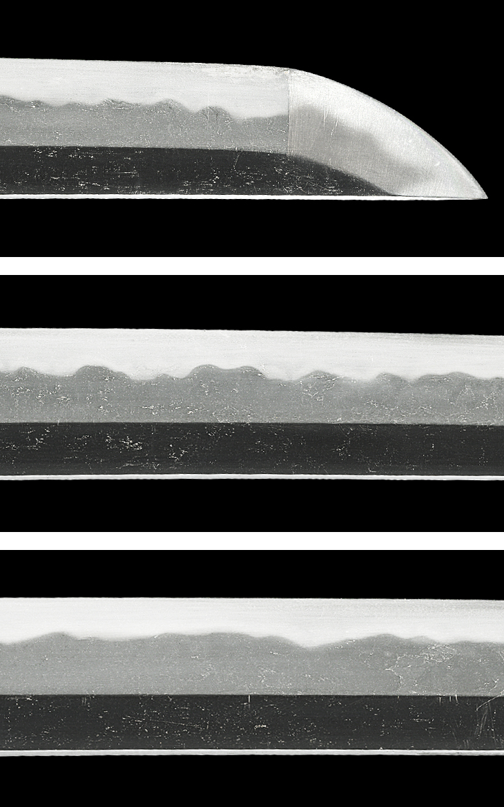 平造り、庵棟低め。 鍛え、板目、杢目、流れ肌を交えて肌立ち、地沸厚く付き地鉄良好。 刃文、小互の目良く揃い、刃縁小沸付いて明るく締まり、刃中小互の目足間断なく入り、金筋、砂流し掛かる。 帽子、小乱れて小丸に深く返る。 茎生ぶ、先片山形、鑢筋違い。 銅ハバキ。 時代研磨(ヒケ、曇り有り)。