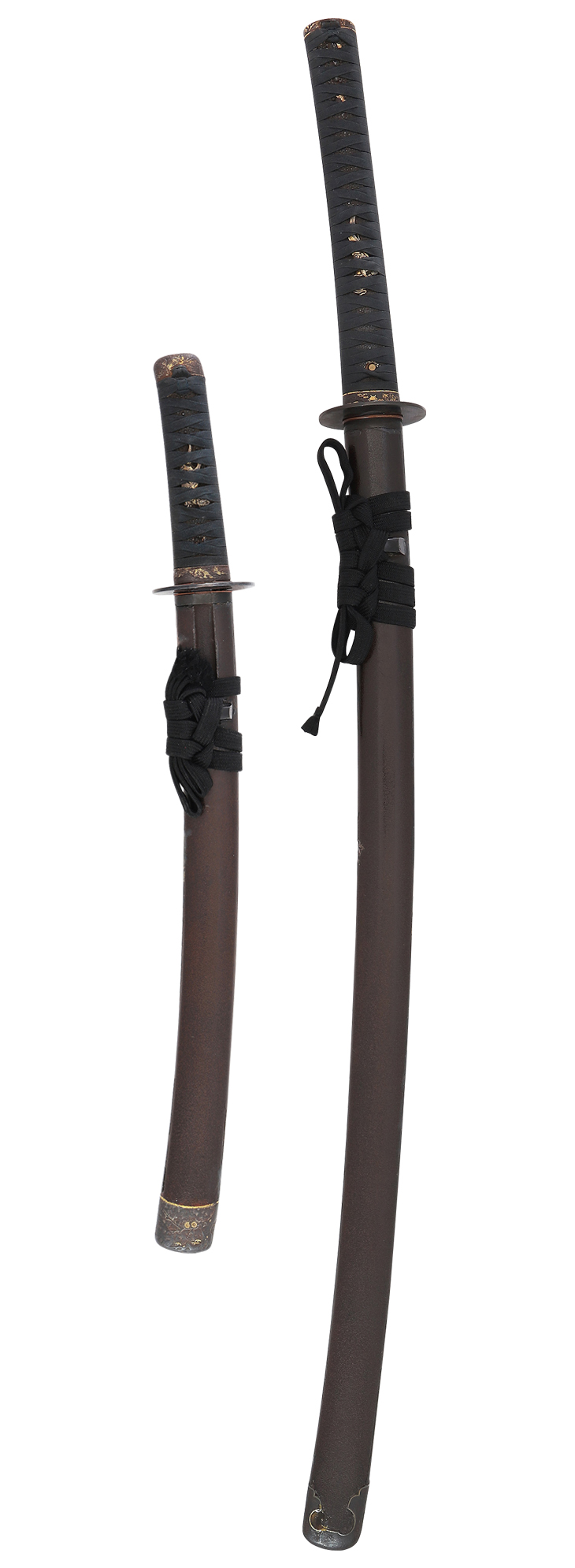 脇差拵え (全長62.5 江戸期 鞘 茶石目地 傷みあり こじり、鉄槌目地鋤出し彫、梅枝図 小柄、赤銅地容彫色絵、竹雀図 下げ緒、黒 柄 黒塗り鮫に黒布巻 縁頭、鉄地鋤出し彫布目象嵌、葉模様図 目貫、素銅地容彫色絵、獅子図 鍔 赤銅研磨地無文)入り。