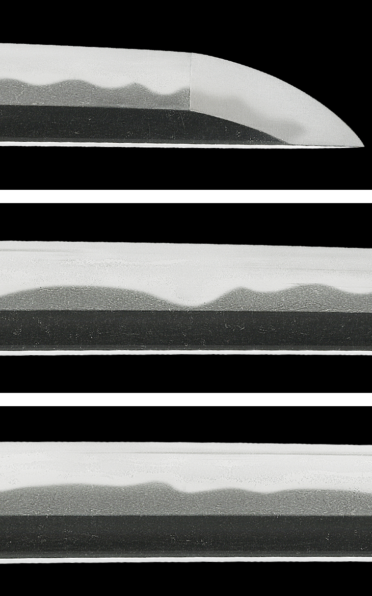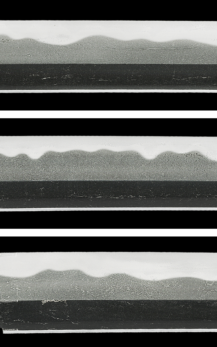互の目乱れ主体の刃文は、刃縁荒沸付いて明るく締まり、二重刃風の沸筋、湯走り掛かり、刃中金筋、砂流し掛かり、一部烈しい沸裂け状を呈するなど、美濃相州伝とも言うべき志津風の覇気あふれる出来映えを示しています。