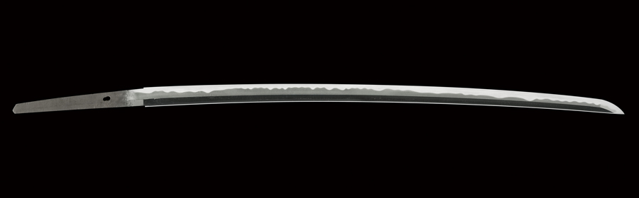 鎬造り、鎬高め庵棟低め、中切っ先やや鋭角となる。 鍛え、小板目に板目交じりで所々流れ心に肌立ち、地沸厚く付き、地景繁く入り、地鉄良好。 刃文、互の目乱れに小互の目、尖り風の刃、角張った刃を交え、刃縁荒沸付いて明るく締まり、二重刃風の沸筋、湯走り掛かり、刃中小互の目足、葉入り、金筋、砂流し掛かり、一部烈しい沸裂け状を呈する。 帽子、湾れ調で沸付いて匂い深く、先掃き掛け返る。 茎生ぶ、先刃上がりの入山形、鑢平地大筋違い鎬地切り。 銅に金着せハバキ。 時代研磨。 白鞘入り。