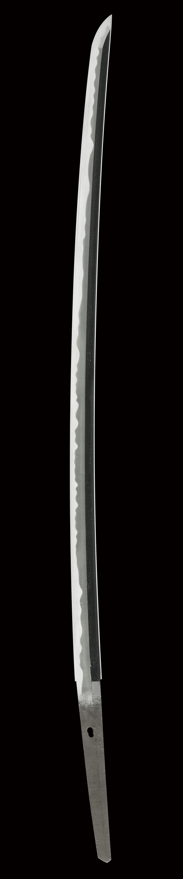 本作は、寸法二尺四寸六分強、切っ先やや鋭角で、反りもやや浅め、身幅、重ねしっかりとした勇壮な一振り、地刃健全、茎も生ぶで穴一つ、刀がズシッと重いです。