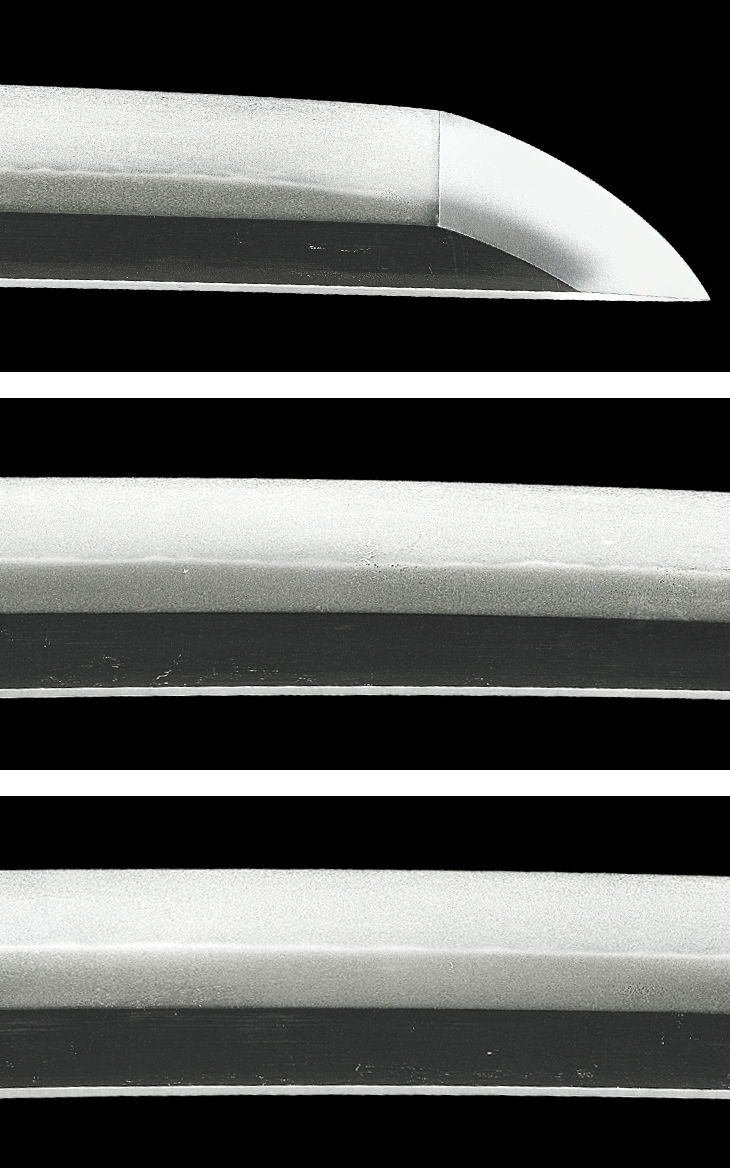 鎬造り、鎬高め庵棟低い、中切っ先。 鍛え、小板目肌やや沈み勝ちに詰み、所々流れて肌立ち、地沸厚く付き、地景入り、地鉄良好。 刃文、広直刃調で、刃縁匂い勝ちに明るく締まり、刃中小足、小互の目足、葉良く入る。 帽子、直調で焼き深く、先小丸風に長く焼き下げる。 茎生ぶ、先栗尻、鑢浅い勝手下がり。 銅に金着せハバキ。 時代研磨。 白鞘入り。