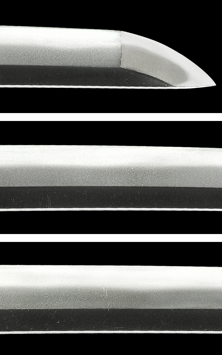 鎬造り、鎬尋常庵棟低い、中切っ先。 鍛え、小板目に小杢目を交えて良く詰み、所々肌立ち、地沸微塵に厚く付き、地景繁く入り、地鉄概ね精良。 刃文、湾れ調の刃取りで、小互の目足頻りに入り、刃縁良く沸付いて匂い深く明るく冴え、所々金筋、砂流し掛かる。 帽子、直調で沸付き、二重刃掛かり、先掃き掛け返る。 茎生ぶ、先浅い入山形、鑢目筋違い。 銅に金着せ二重ハバキ。 時代研磨(ヒケ有り)。 白鞘入り。