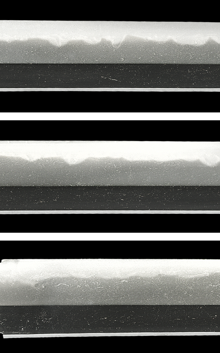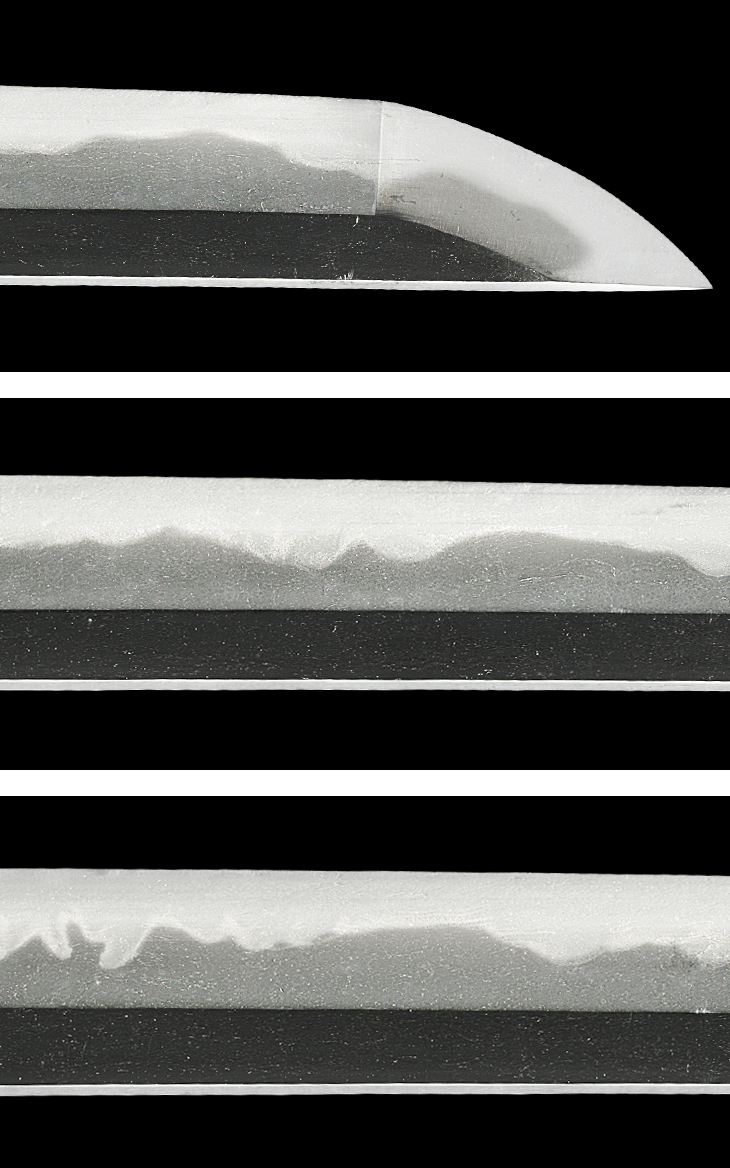 互の目に小互の目、小乱れ、湾れ交じりで、刃縁やや沈み勝ちに締まり、刃中葉、小互の目足入り、繊細な金筋、砂流し掛かる出来は、新刀祐定風でありながら、刃がやや沈み勝ちで刃形に大らかさがないので、新刀高田系統でしょうか。