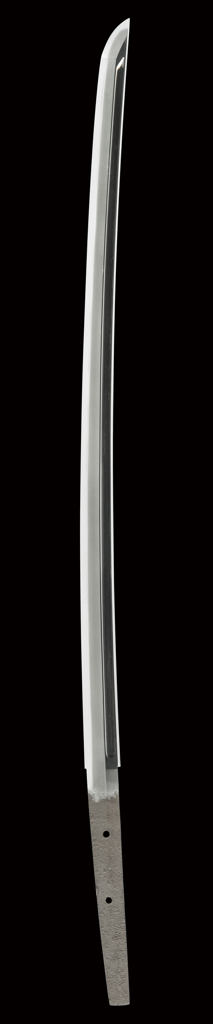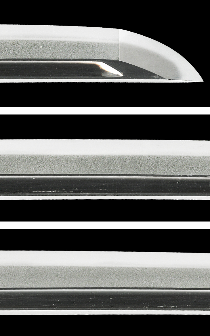 鎬造り、鎬庵棟尋常、中切っ先。 表裏共に棒樋をハバキ上で丸留める。 鍛え、小板目肌良く詰み、地沸微塵に厚く付き、細かな地景繁く入り、地鉄精良。 刃文、中直刃調で、刃縁小沸良く付いてやや沈み勝ちに締まり、刃中小足、小互の目足、葉入る。 帽子、直調で小沸付き、先小丸に返る。 茎磨り上げ、先切り、鑢筋違い。 銀に金鍍金ハバキ。 時代研磨(ハバキ下に細かな刃アタリ有り)。 白鞘入り。