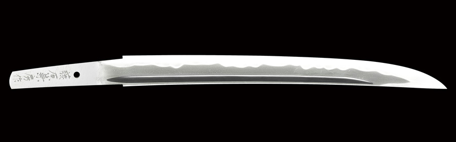 平造り、庵棟低い。 表裏共に棒樋をハバキ下で掻き流す。 鍛え、板目総体的流れて肌立ち、地沸厚く付き、地景繁く入り、地鉄良好。 刃文、互の目乱れ主体で、小互の目、湾れを交え、刃縁匂い勝ちに小沸付いて明るく締まり、刃中互の目足入り、所々金筋、砂流し掛かる。 帽子、湾れ込んで、先尖り風に掃き掛け返る。 茎生ぶ、先栗尻、鑢筋違い。 銀に金鍍金ハバキ。 時代研磨(小サビ有り)。 白鞘入り。
