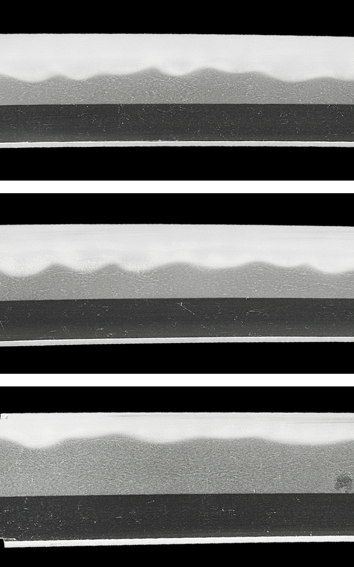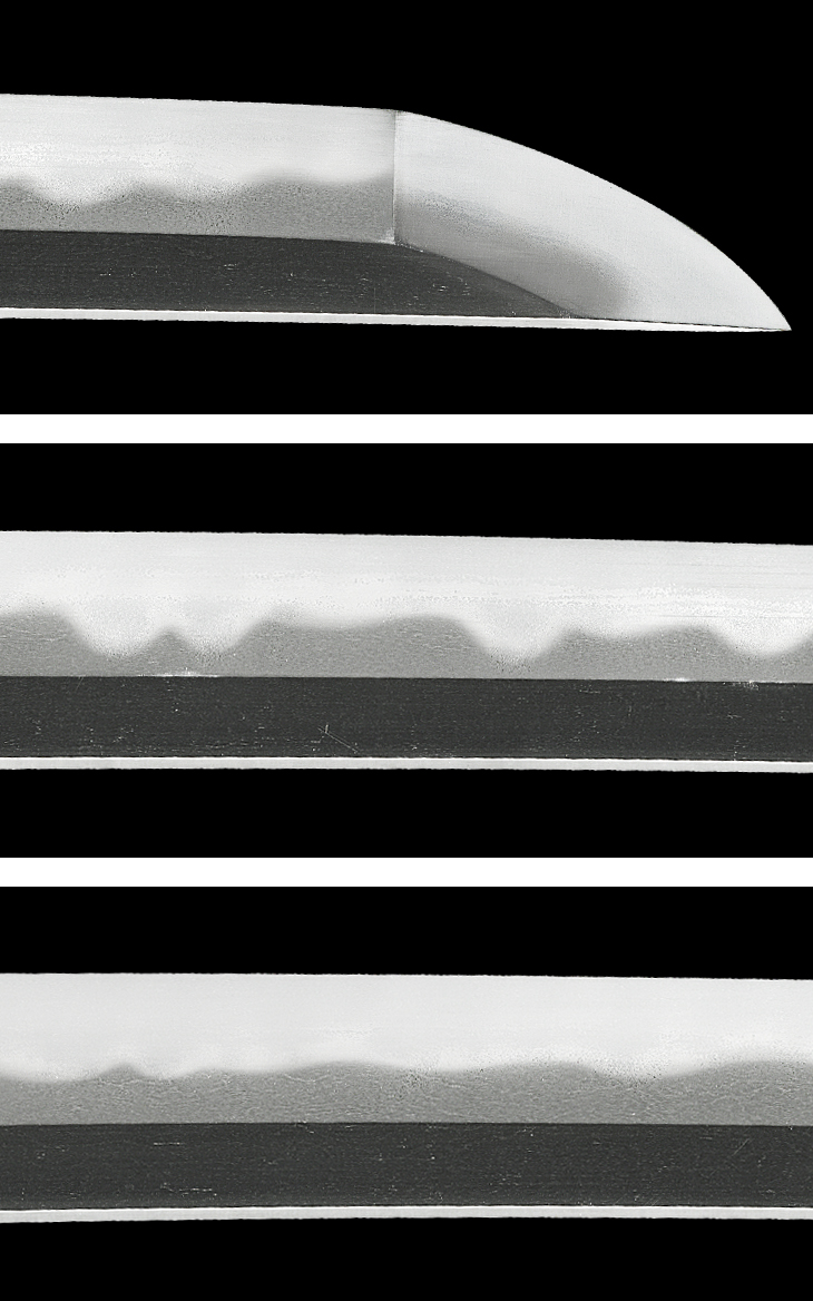 板目流れ心に良く鍛えられた地鉄は、地沸微塵に厚く付き、地景繁く入り、互の目乱れ主体の刃は、小互の目、丁子風の刃、尖り風の刃を交え、刃縁荒沸付いて締まり気味となり、刃中互の目足繁く入り、太い金筋、砂流しが掛かっています。